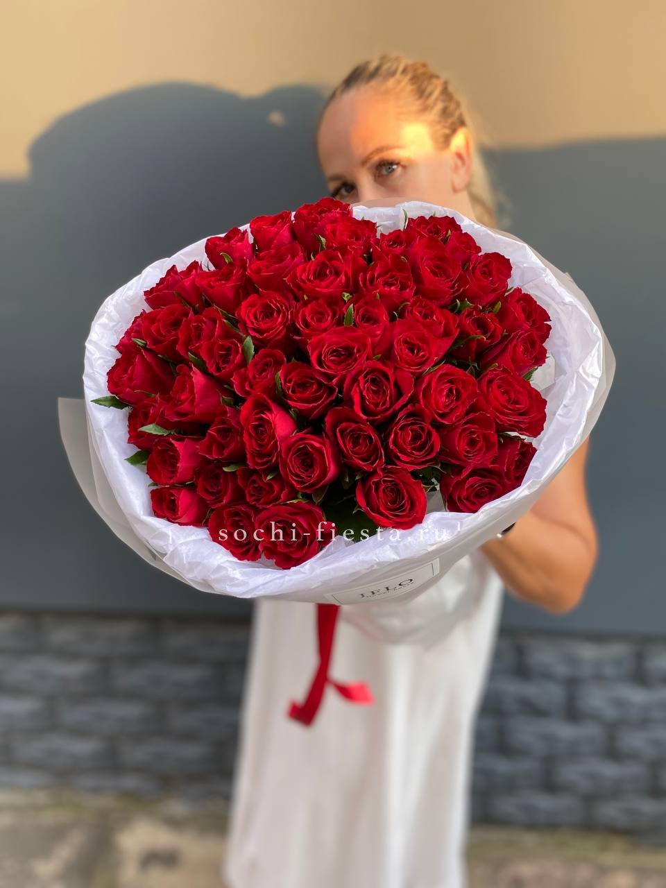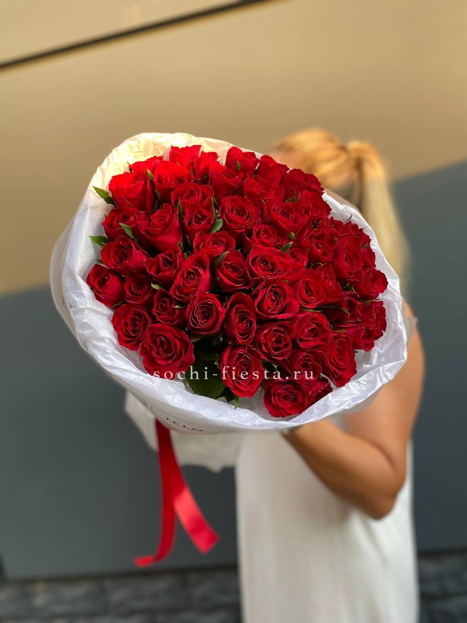 51 роза мадам ред в нежном оформлении