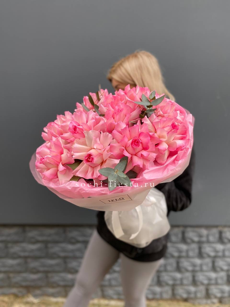 Одиннадцать французских роз выстроены в округлую композицию с веточками эвкалипта. Бутоны крупные и плотные, держат форму и наполняют пространство свежим присутствием.