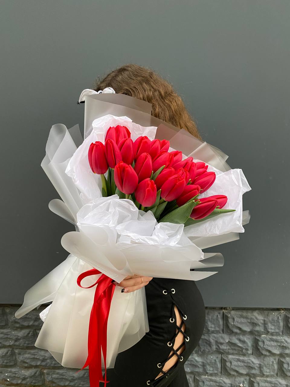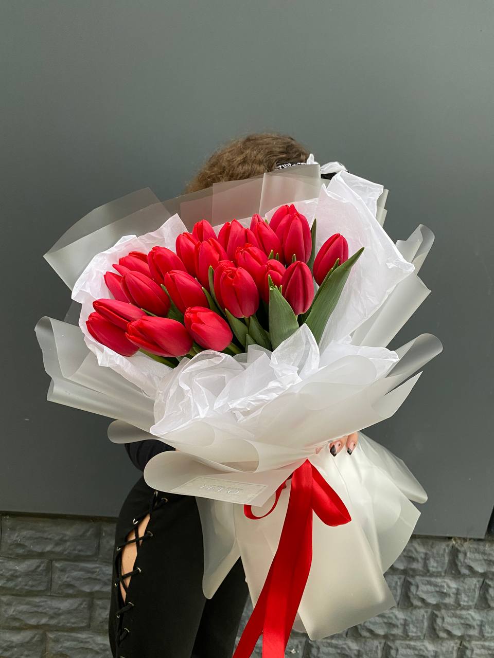 Двадцать пять алых тюльпанов выстроены в насыщенный монохромный букет. Красный цвет звучит уверенно и создаёт яркое впечатление с первого взгляда.