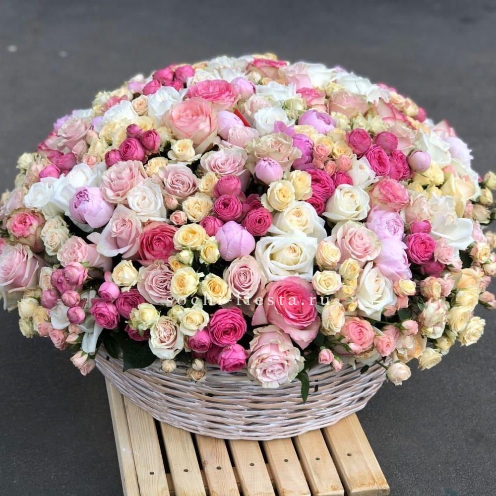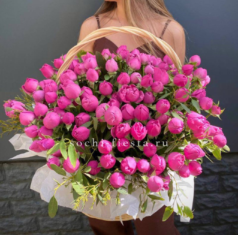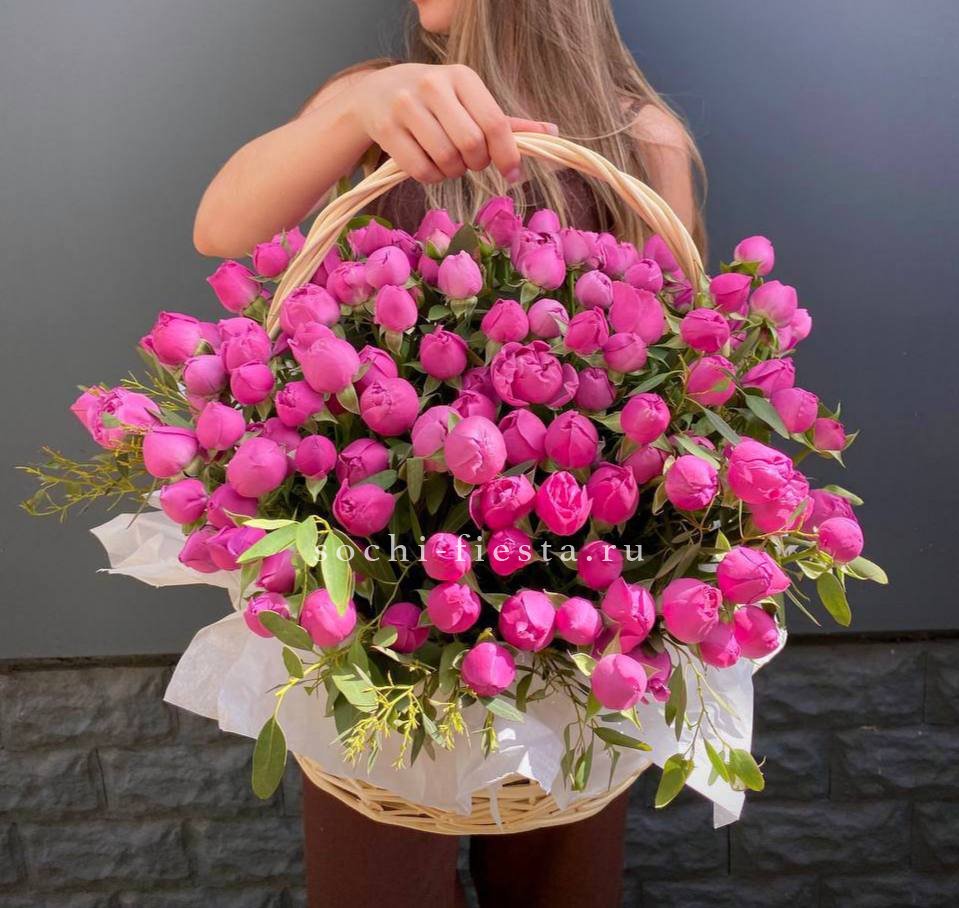 Сорок пять французских роз с вывернутыми лепестками образуют плотную композицию в плетёной корзине. Джумилия раскрывается широко и создаёт объёмную фактуру с глубокими переливами оттенков.