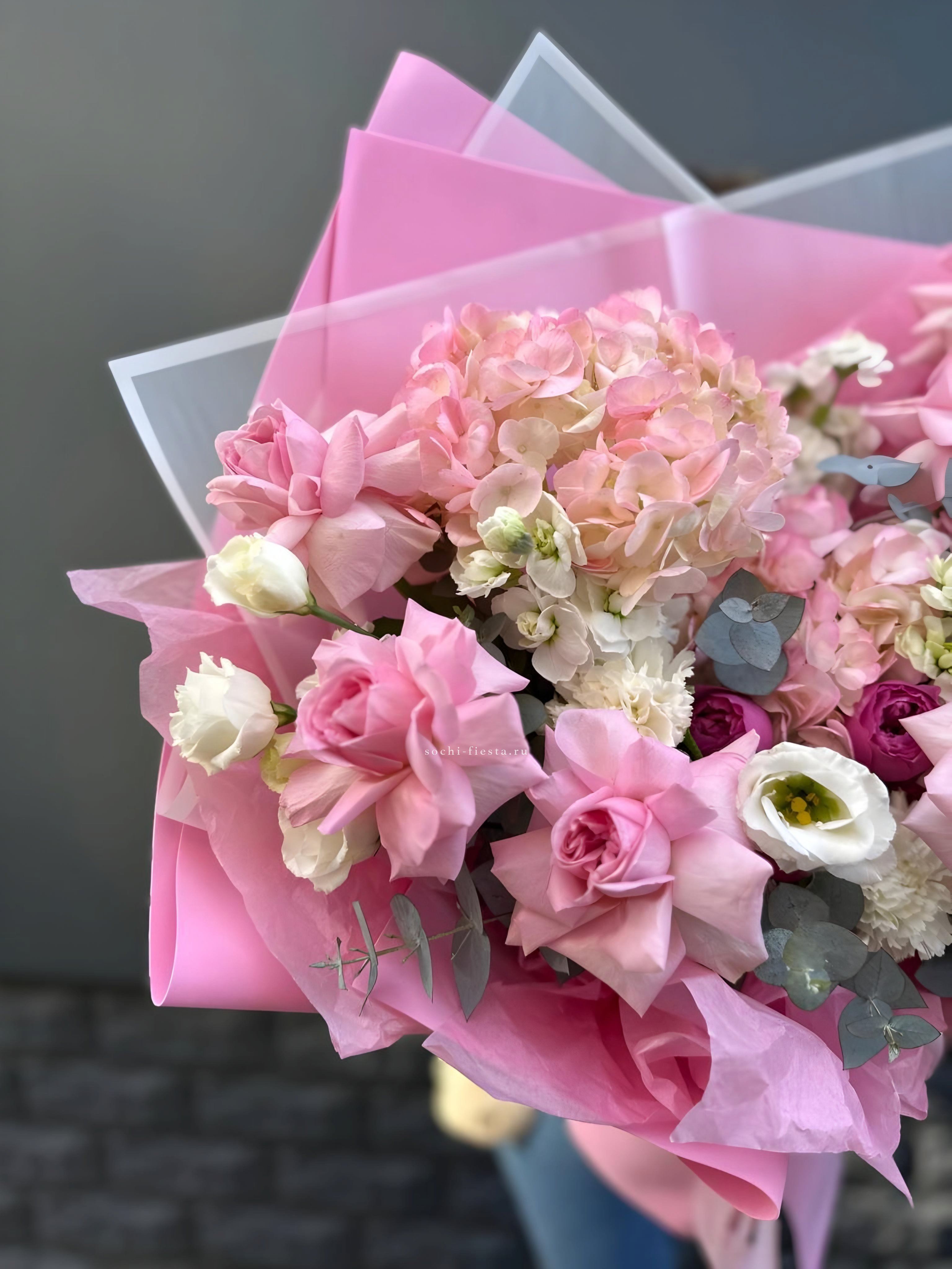 гортензия, хризантема, белая роза, гербера, статица, хлопок, упаковка.