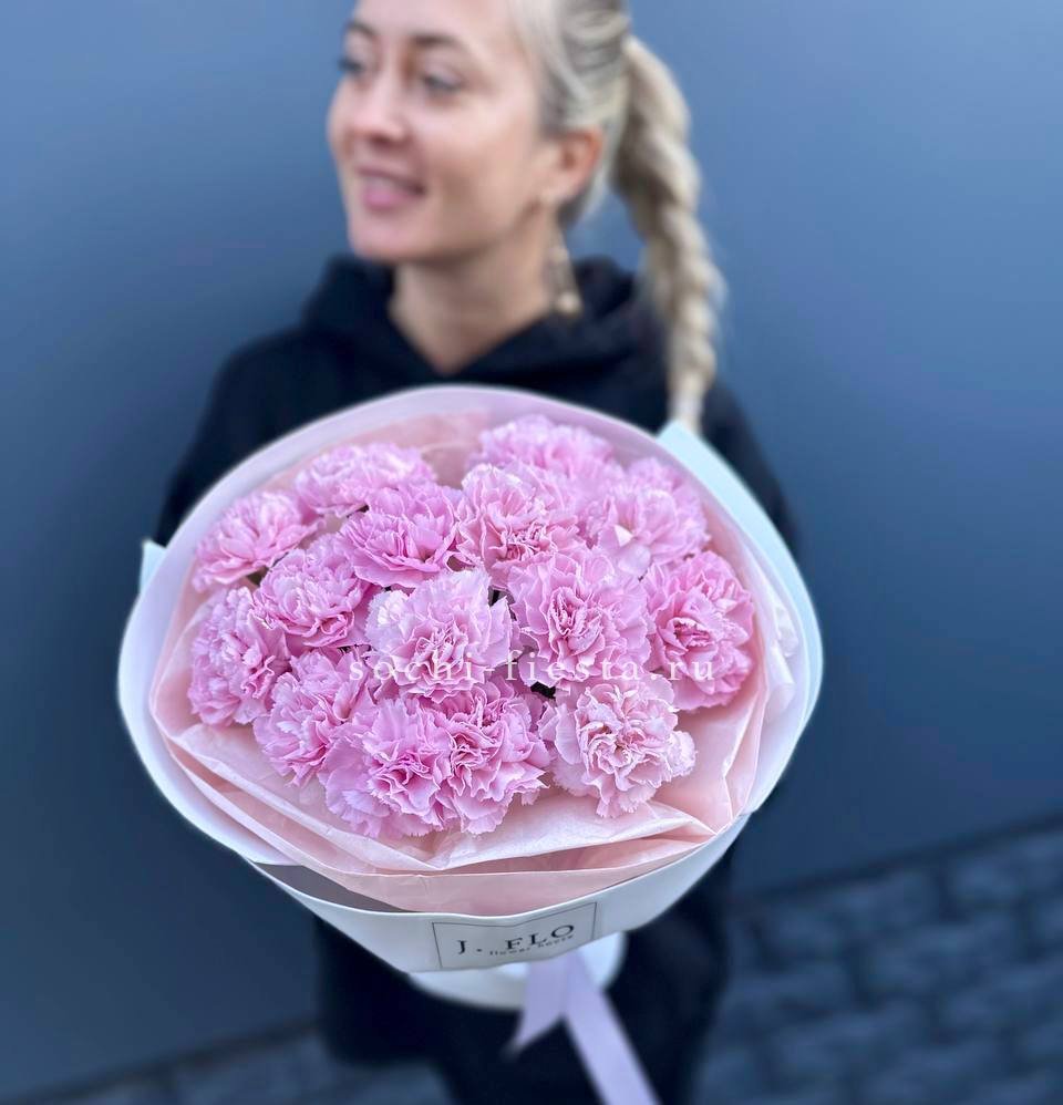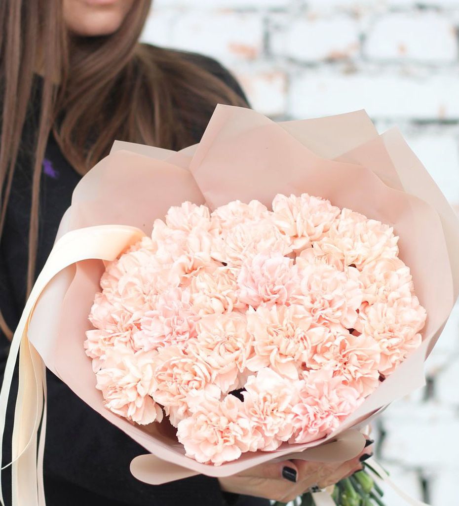 Букет из пятнадцати белых диантусов вписывается в любое пространство благодаря компактной форме. Цветы долго сохраняют свежесть и не требуют сложного ухода.
