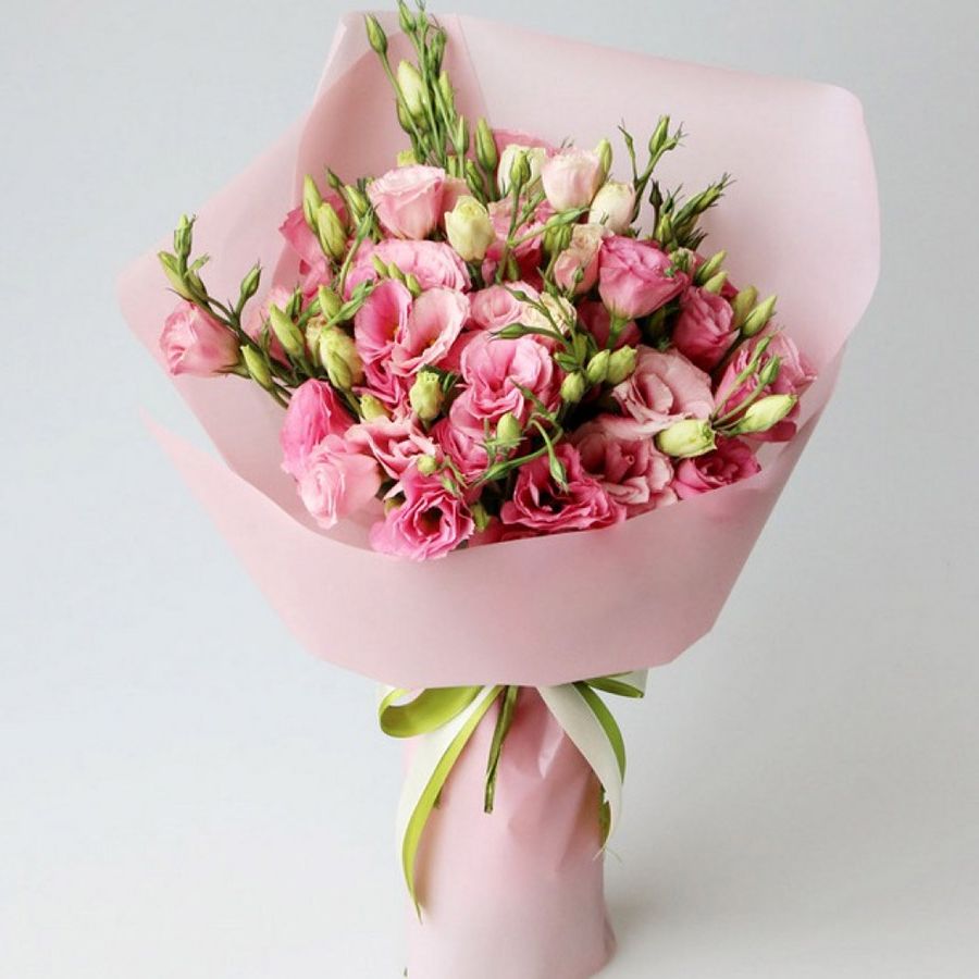 Сто один стебель белоснежной эустомы с многоярусными бутонами собраны в воздушный букет. Каждый цветок напоминает миниатюрную розу и вместе они образуют лёгкую скульптурную форму.
