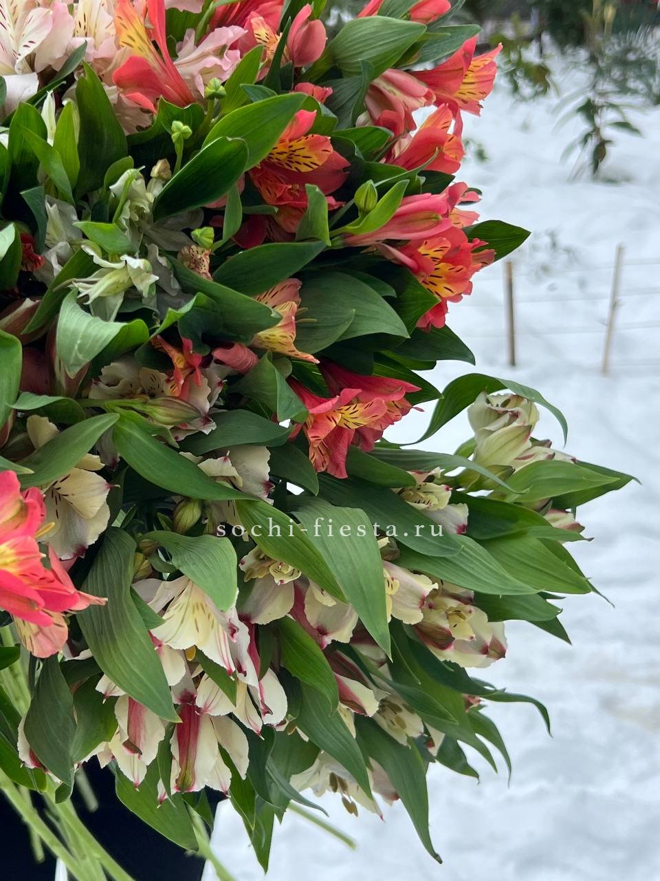 Пятьдесят одна ветка альстромерий — это масштабная композиция с выраженным визуальным присутствием. Букет заполняет пространство и привлекает внимание своим объёмом.