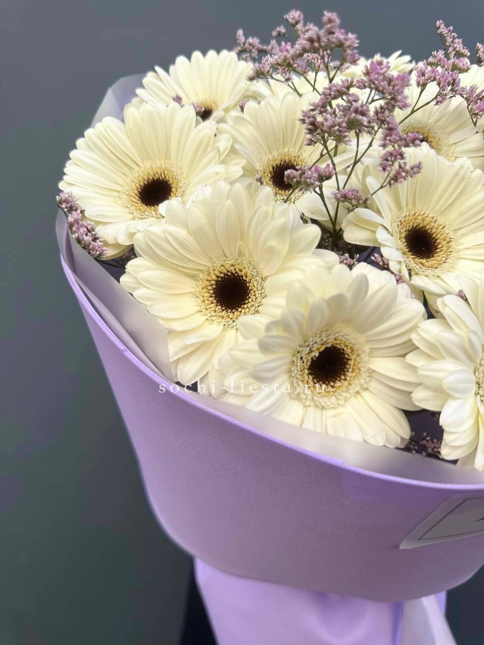 голландская гербера 15 шт., лимониум,  лента, дизайнерская упаковка.