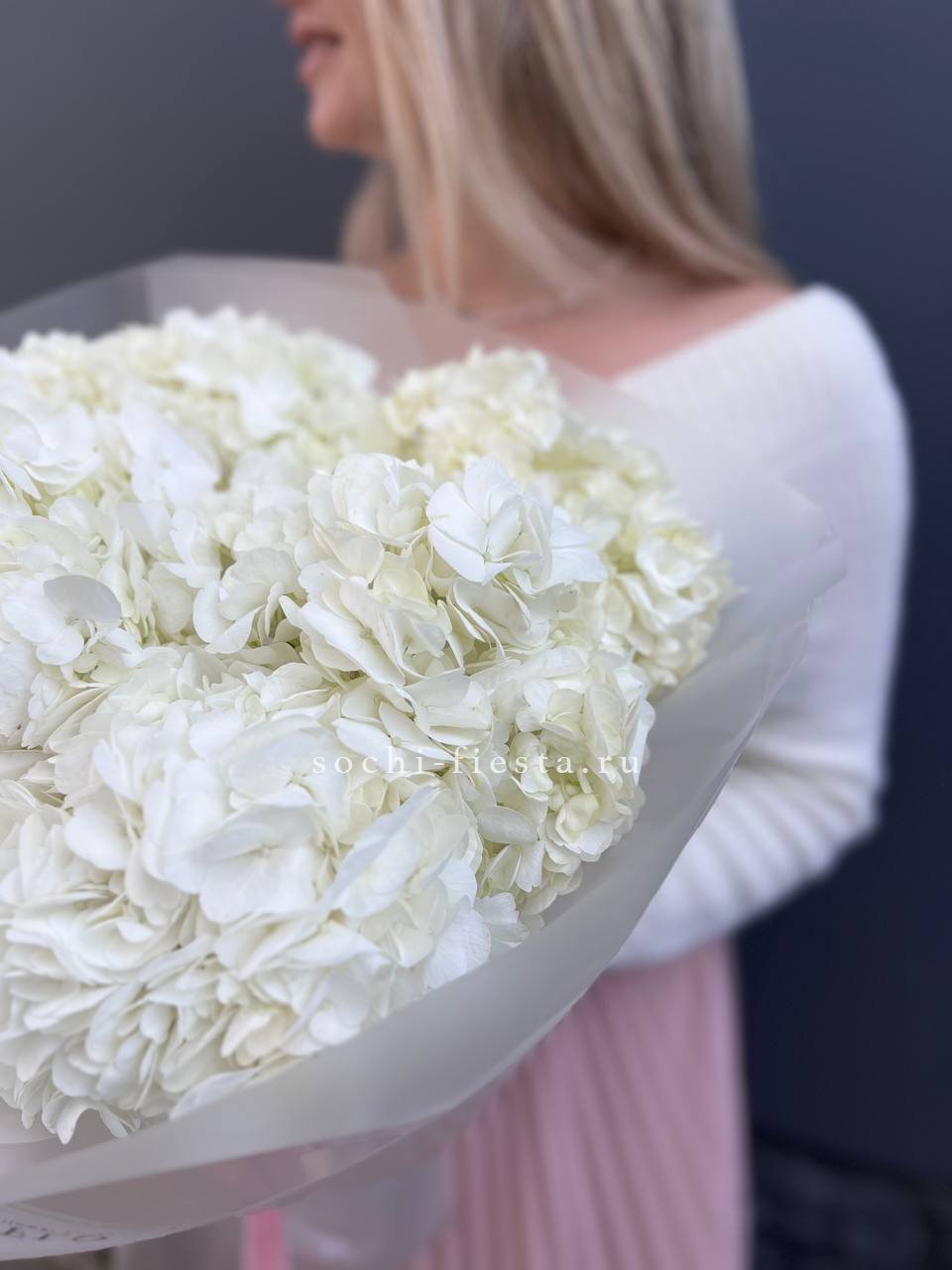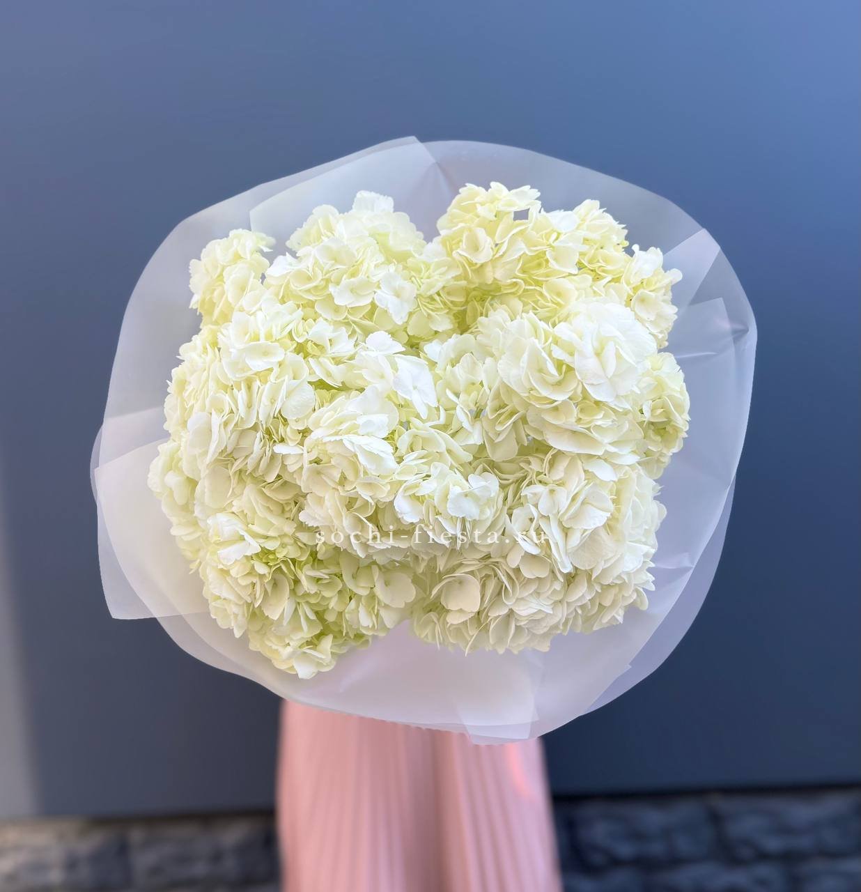 Гортензия в дизайнерской упаковке с текстильным акцентом выглядит современно и лаконично. Необычная подача придаёт букету характер, делая его запоминающимся дополнением момента.