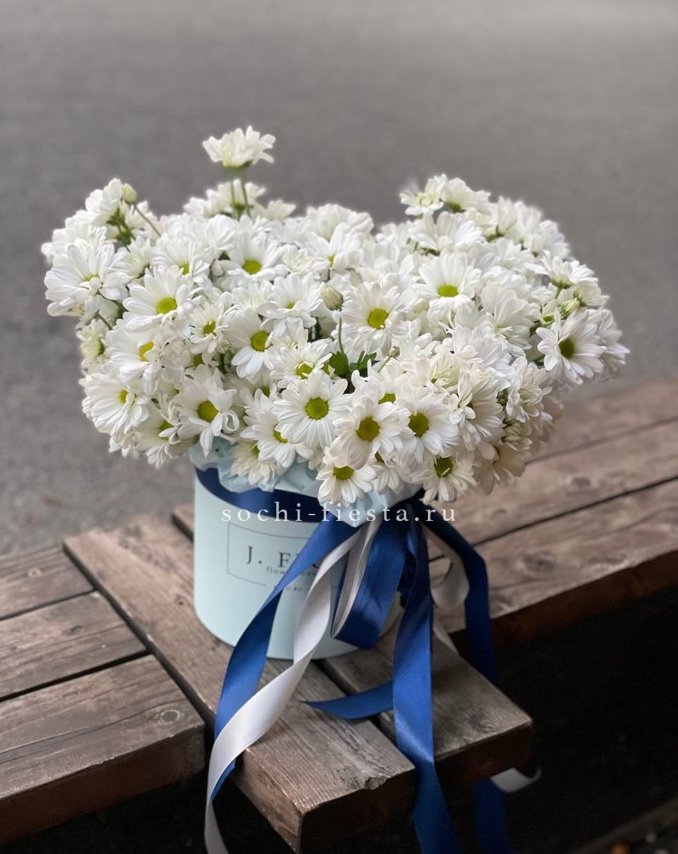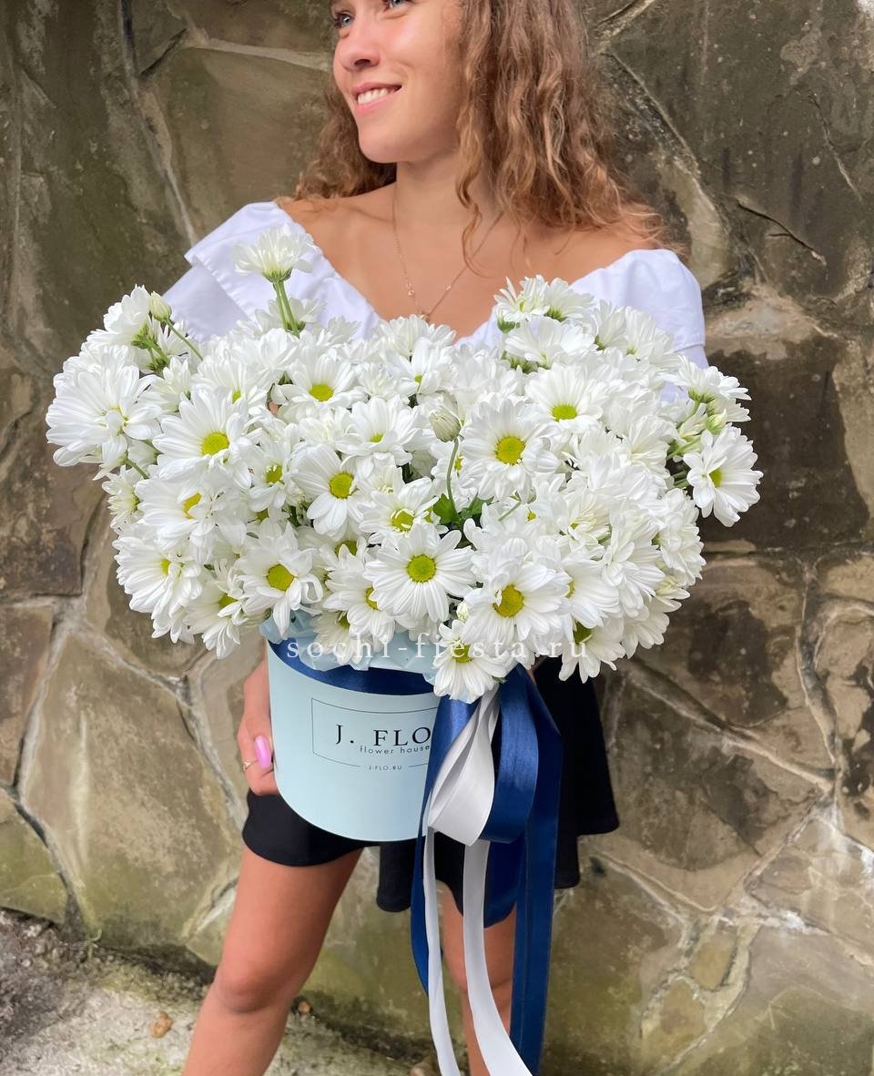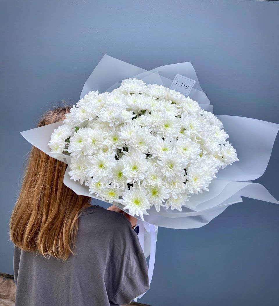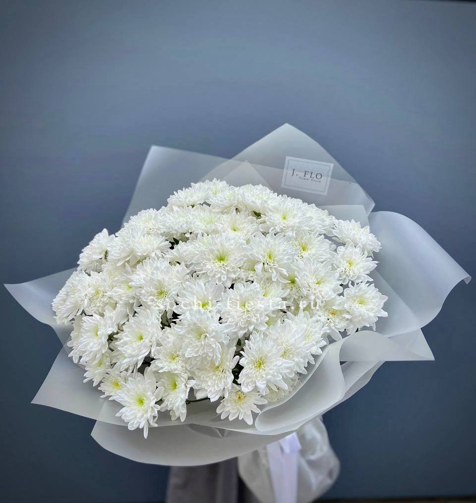 Пять веток кустовой хризантемы с множеством соцветий создают пышную воздушную массу. Букет напоминает утренний сад, где каждая ветка живёт своим ритмом и дарит ощущение лёгкости.