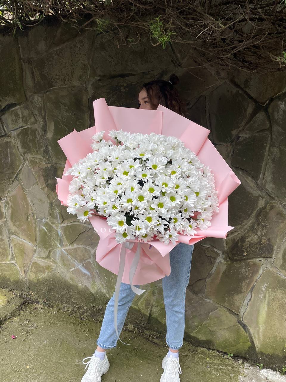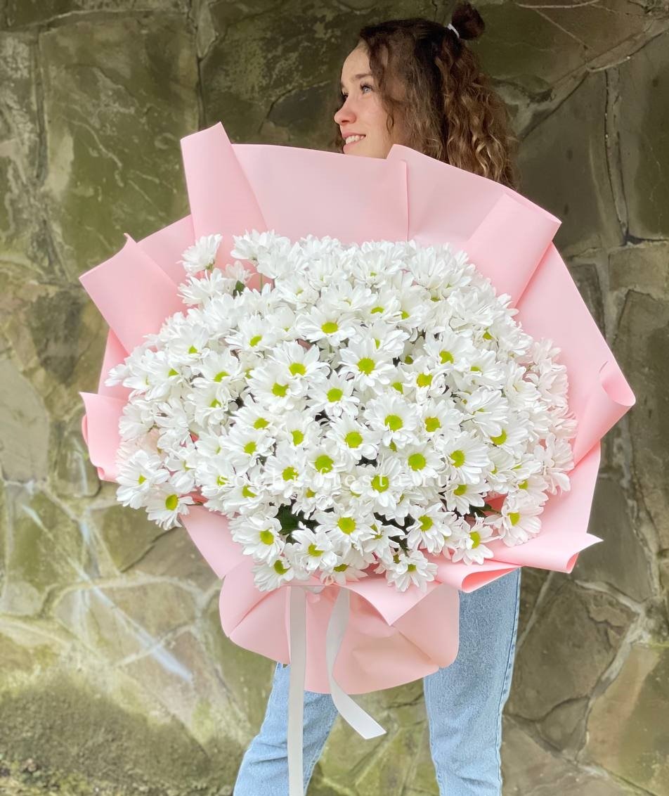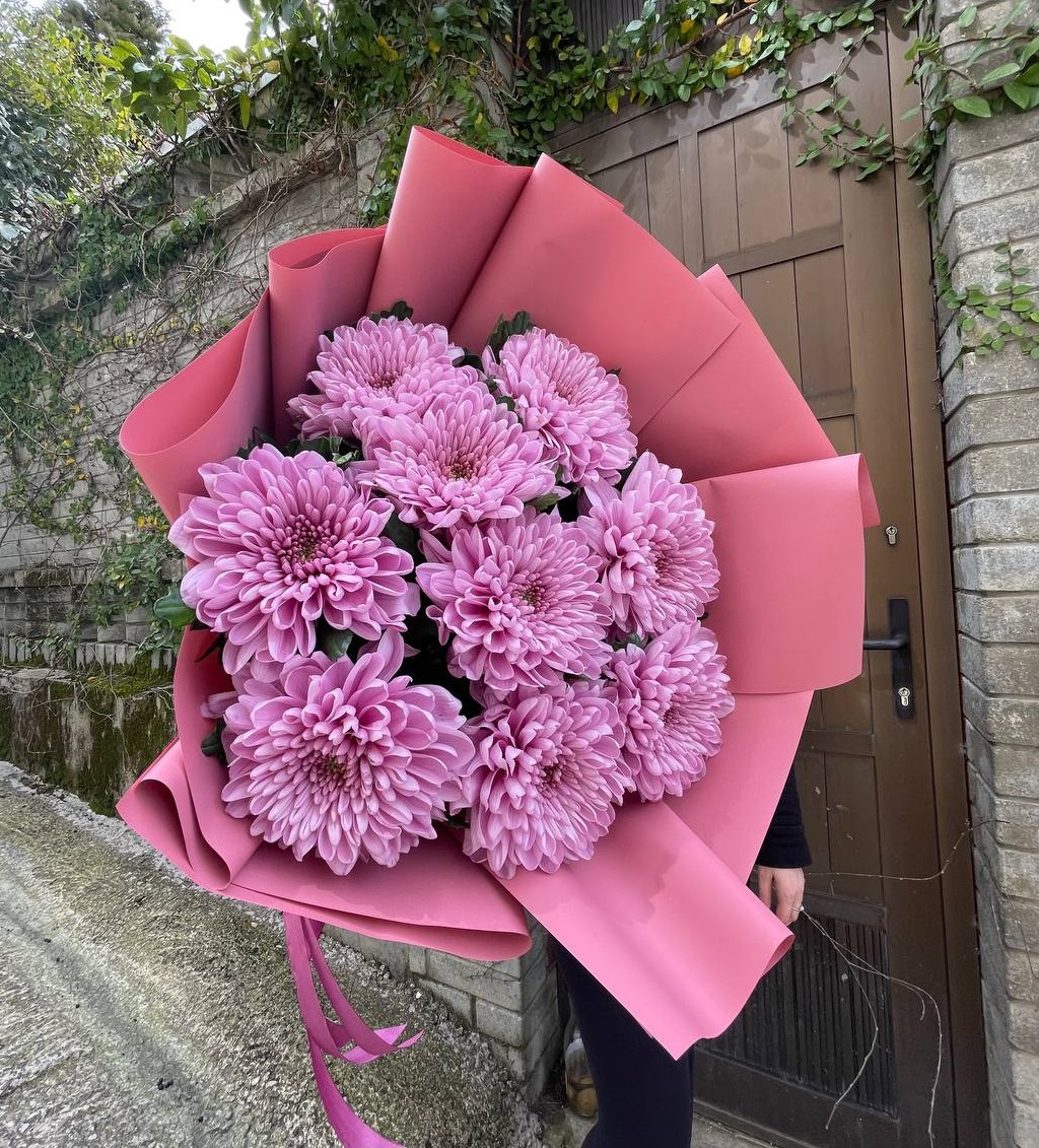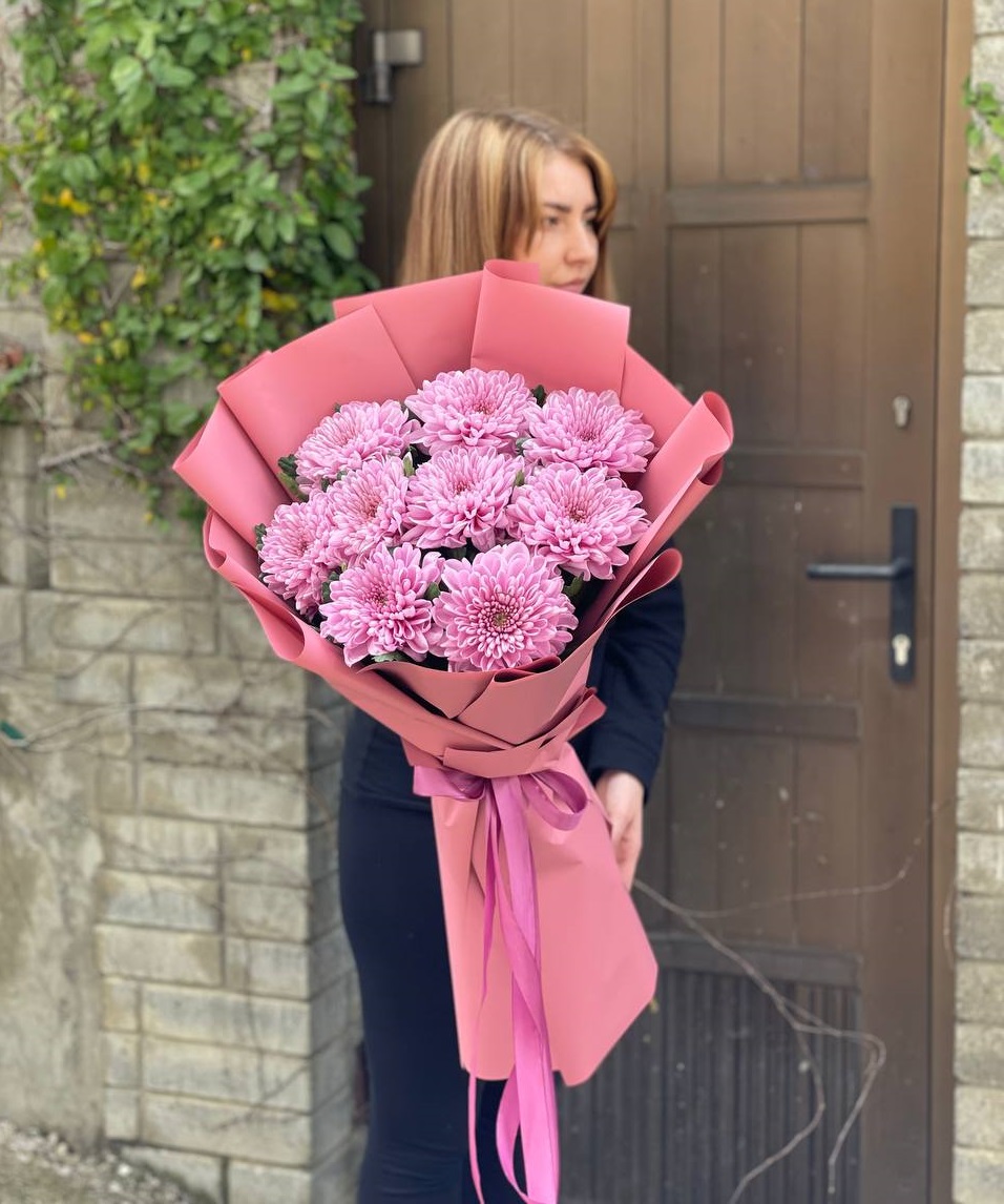 Пятнадцать веток кустовой хризантемы образуют пышное облако из множества соцветий. Каждая ветка раскрывается по-своему, создавая живую текстуру и объёмный силуэт букета.