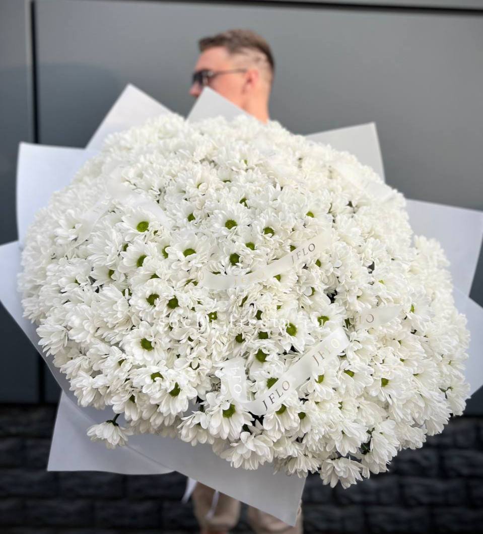 Пушистые коробочки хлопка добавляют воздушности между соцветиями хризантем. Природная фактура встречается с декоративной упаковкой в компактной форме. Букет держит объём и выглядит свежо несколько дней.