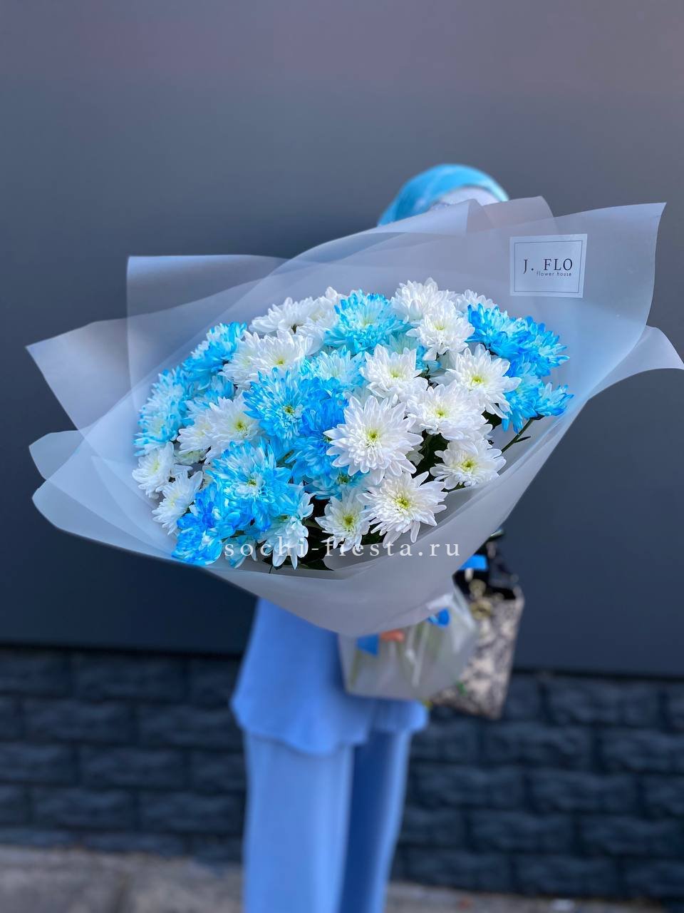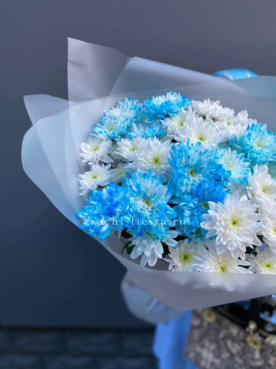 Сорок один бутон собран в плотное соцветие. Хризантемы формируют округлый силуэт с равномерным ритмом и чистой графикой. Монохромное решение с выразительной структурой.
