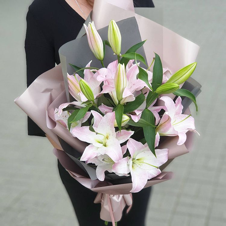 Три розовых лилии в минималистичной упаковке для тех, кто ценит лаконичность. Бутоны раскрываются медленно, сохраняя свежесть и аккуратную форму. Компактная композиция удобна для размещения на столе или узкой полке.