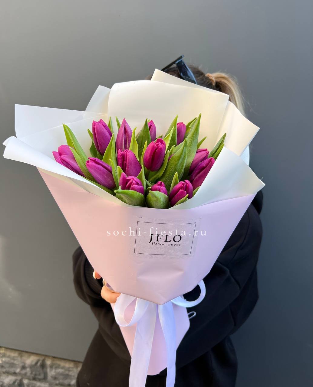 Пятнадцать бутонов насыщенного винного оттенка собраны в плотную вертикальную композицию. Глубокий пурпурный тон создает яркое цветовое пятно в любом интерьере.