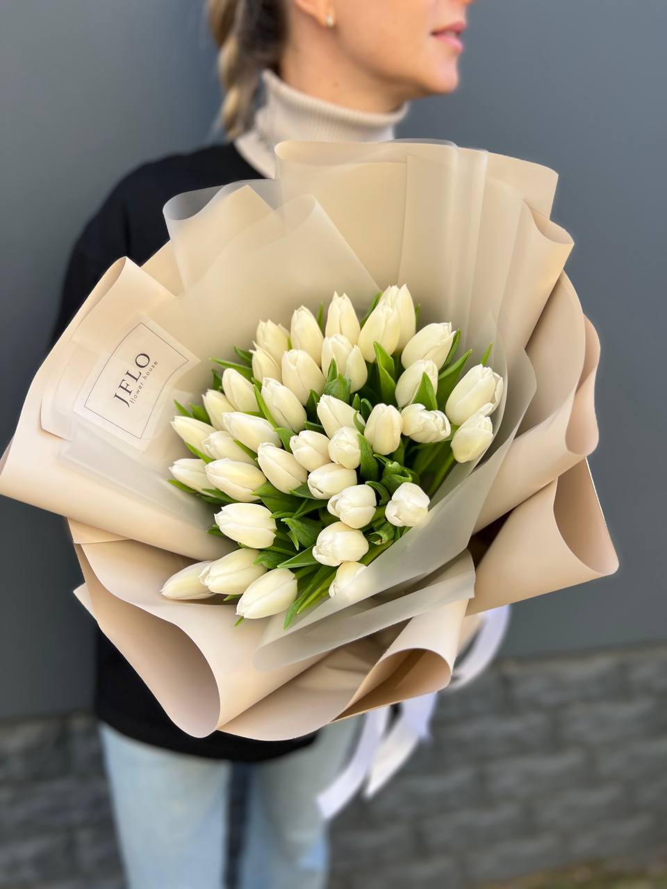 Тридцать пять тюльпанов собраны в плотный монохромный букет, где белизна лепестков создаёт почти графичное впечатление. Чистая форма без лишних деталей позволяет раскрыться природной архитектуре каждого бутона.