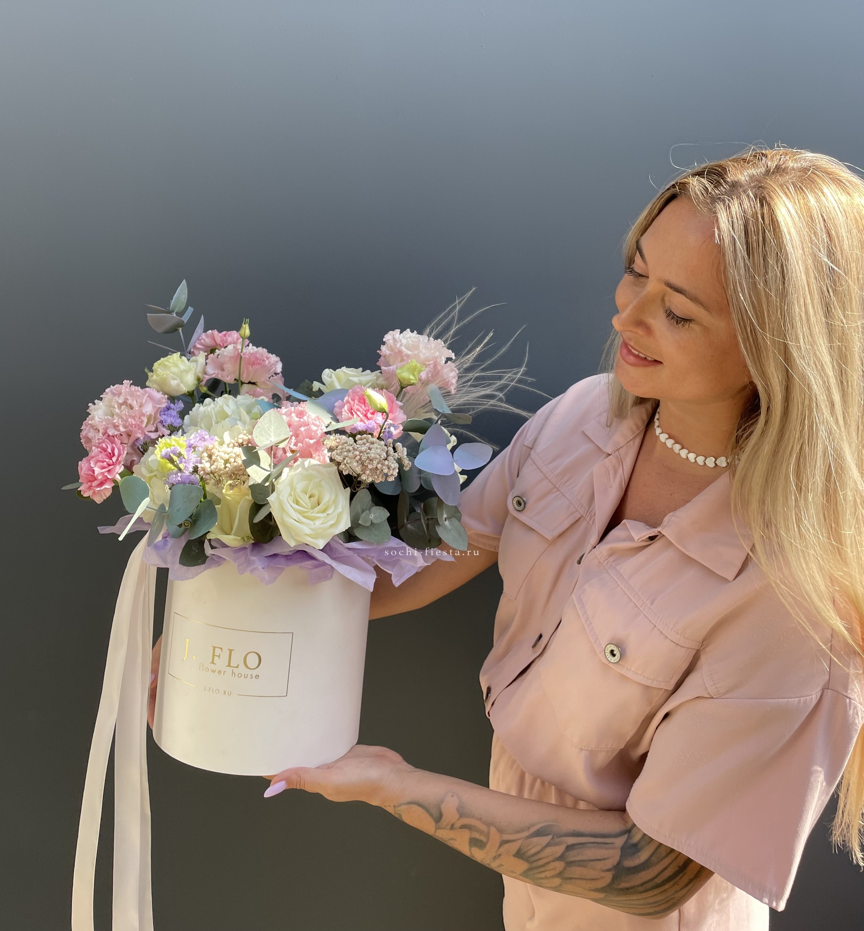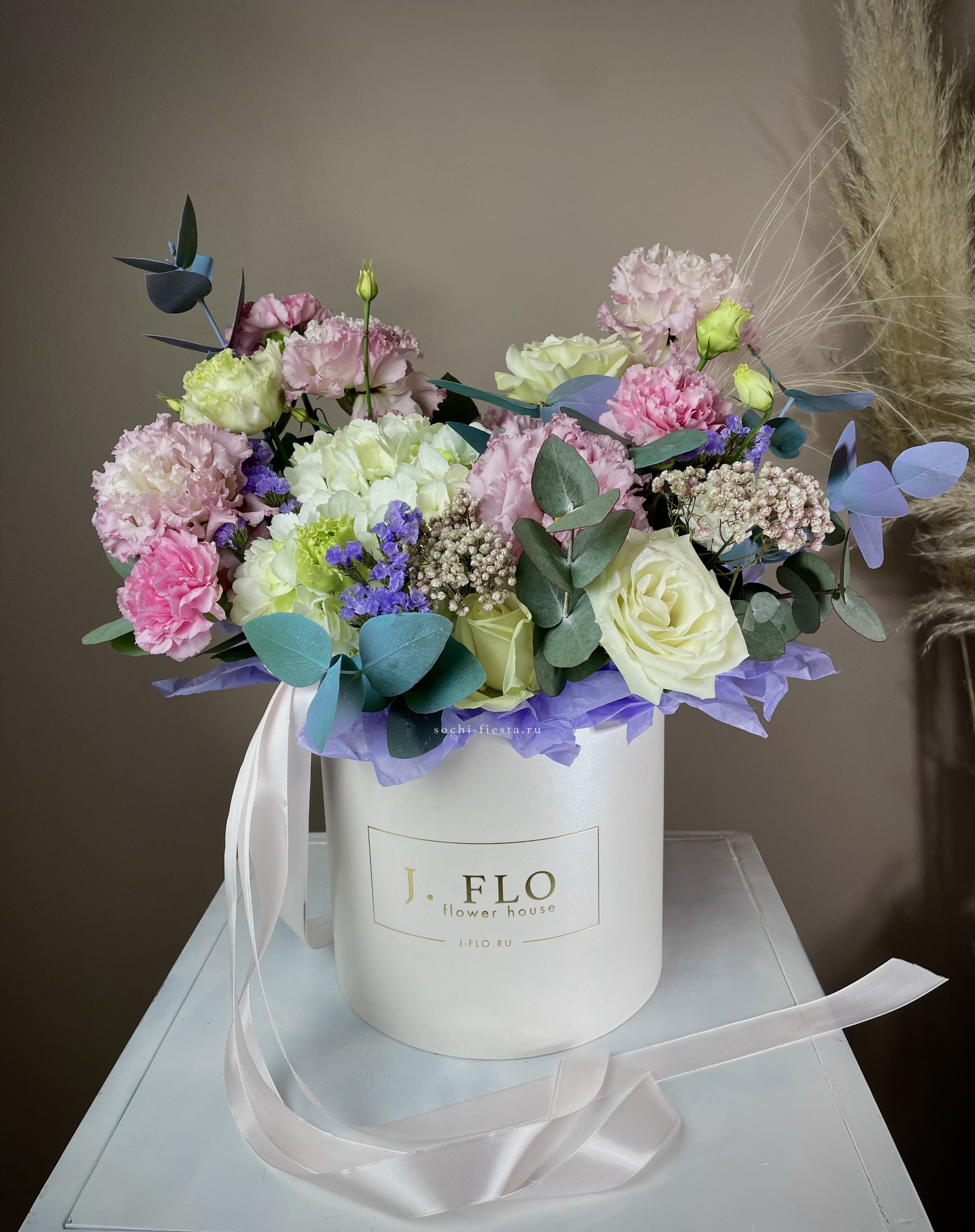 гортензия, диантус, роза, кустовая роза, эустома, эвкалипт, лента, авторская упаковка.