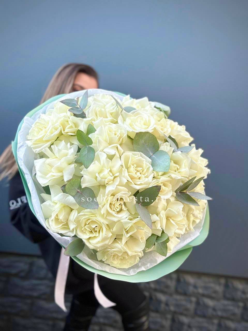 розовая и белая розы, пионовидная роза, кустовые розы, эвкалипт, лента, сумка.