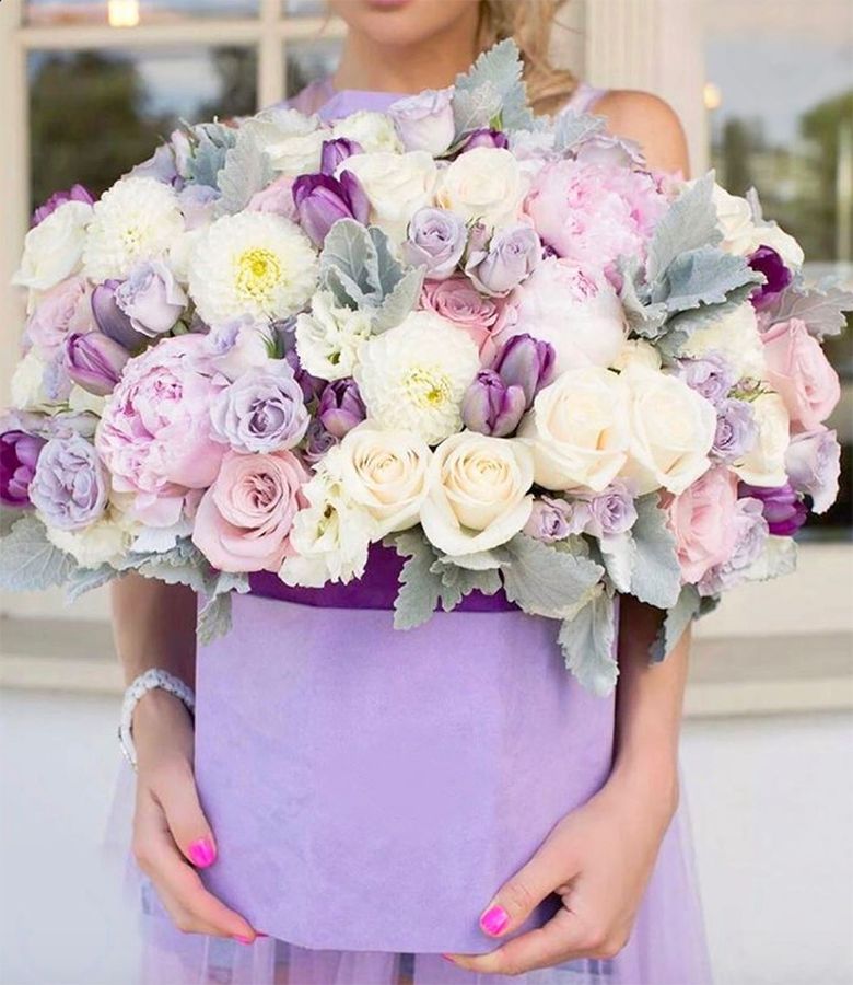 гортензия, эустома, диантусы, розы, эвкалипт и прочие цветы, гармонирующие по фактуре. Цветочная композиция в белых, нежно-сиреневых, розовых тонах в квадратном боксе D25.