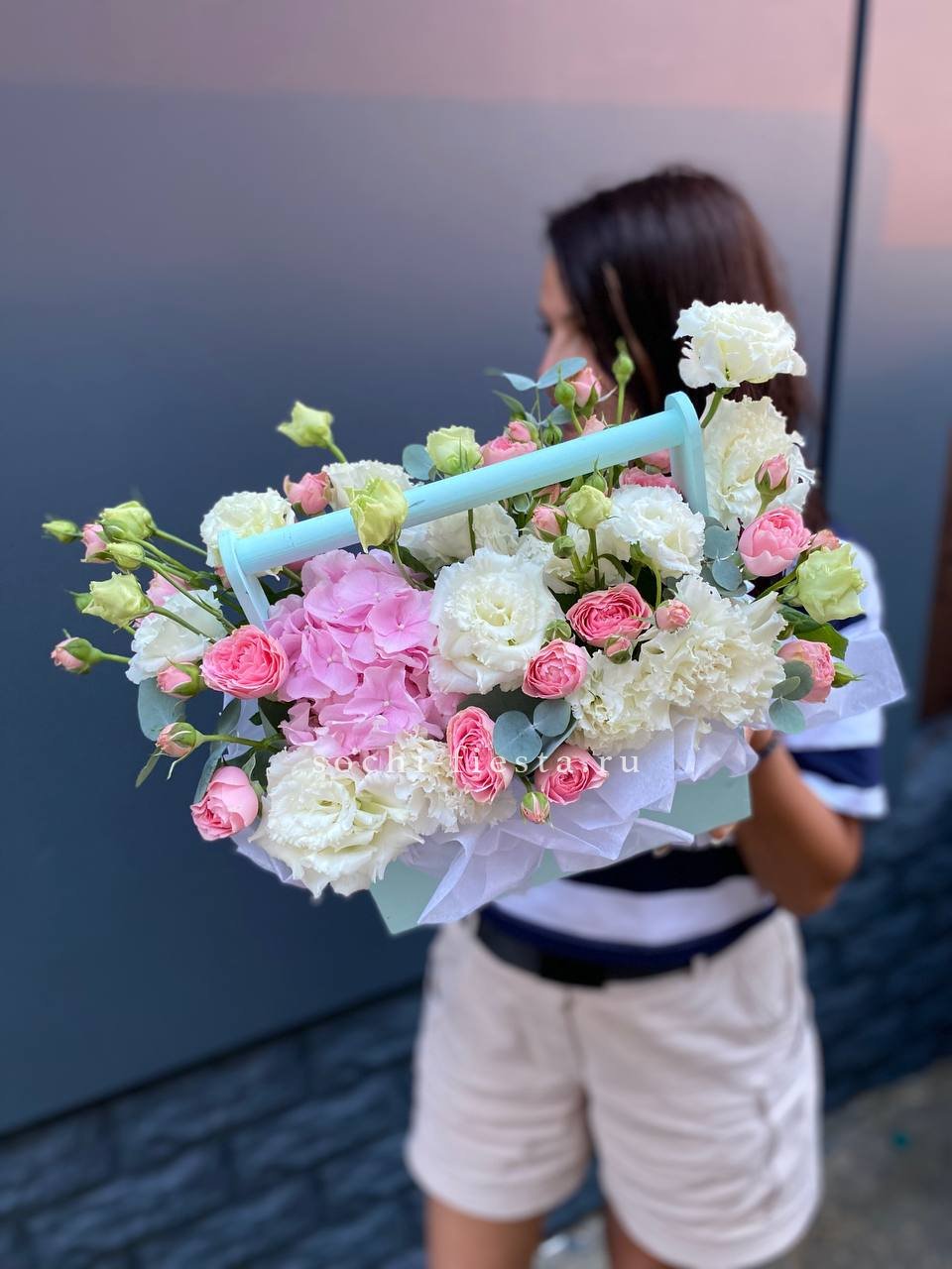 розы, диантусы, эустома, деревянный ящик с колбами.