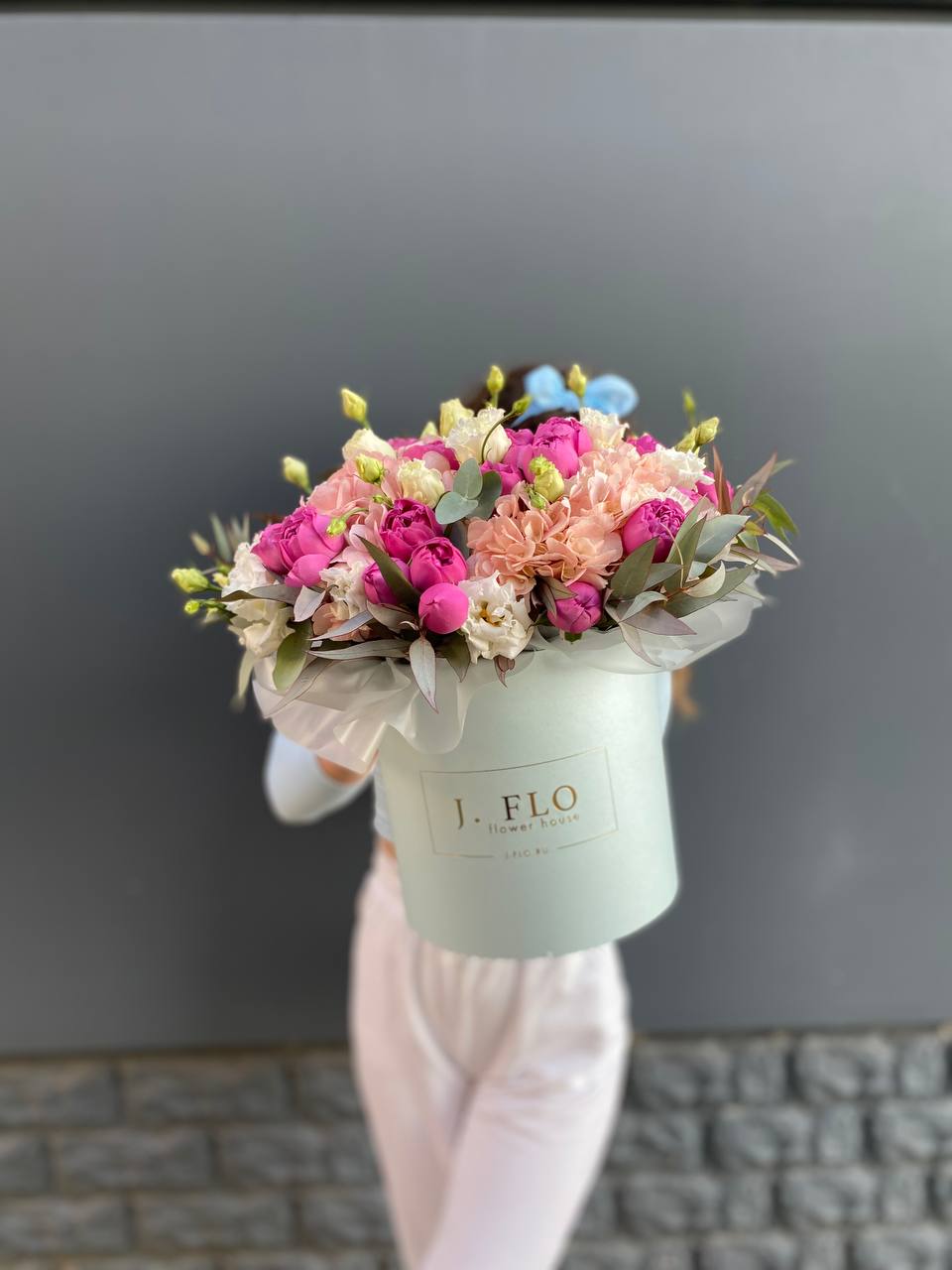 пионовидная роза, гортензия, эустома, декоративная зелень, бокс D20.