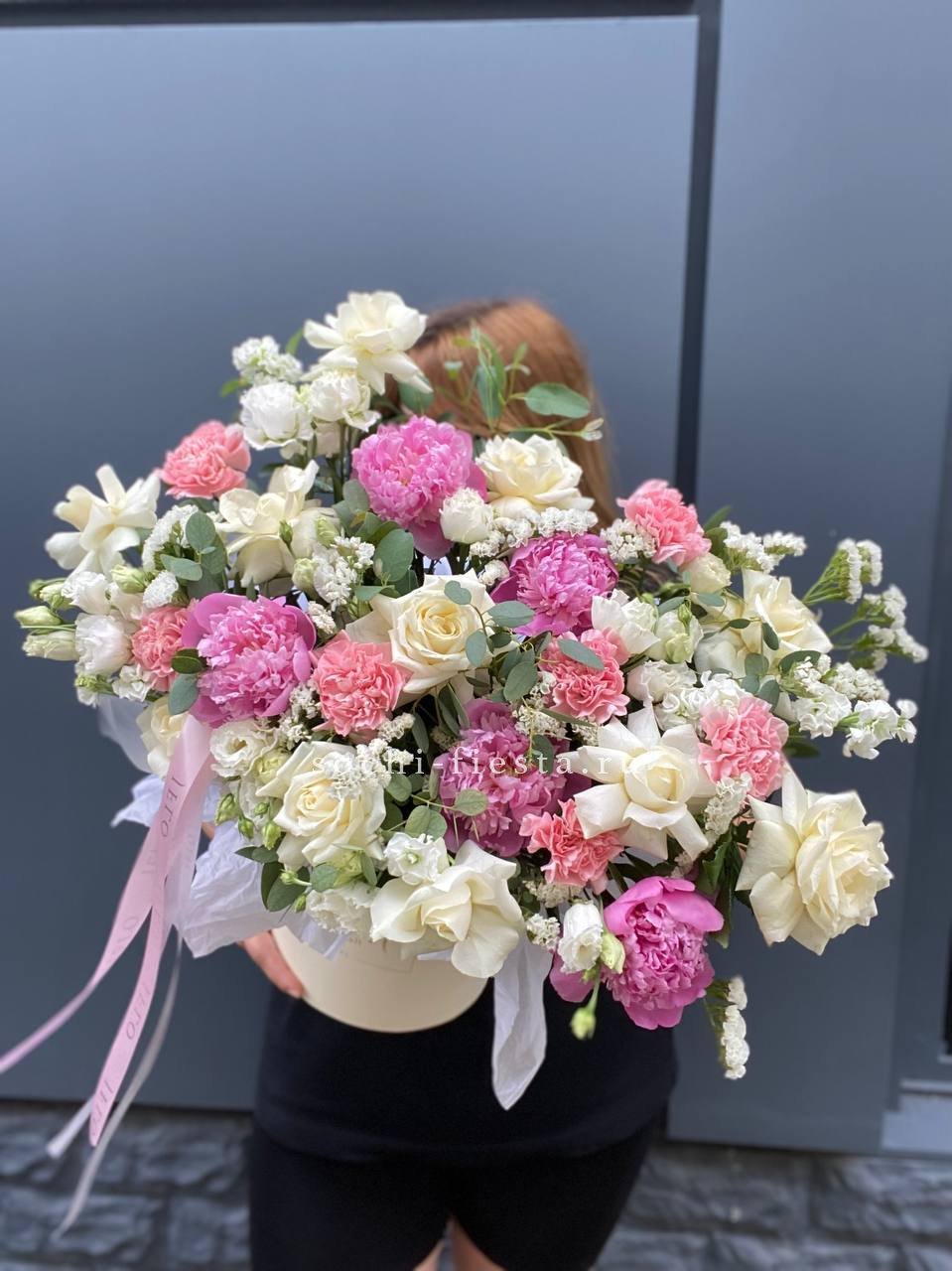 Пионы раскрываются пышными головками, окружённые воздушной статицей и многослойной эустомой. Маттиола вносит лёгкую небрежность, а диантусы расставляют яркие точки в общей картине.