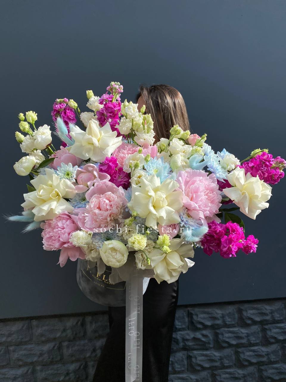 маттиола, пионы, белые розы, эустома, хризантемы, лагурус, бархатный цилиндр D20, эвкалипт, лента, упаковка.