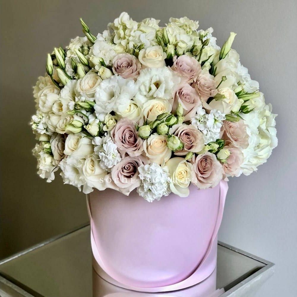 Пышные головки бомбастик наполняют круглую коробку объемом и воздушной структурой. Гортензия добавляет мягкости и завершает композицию в пастельной гамме.