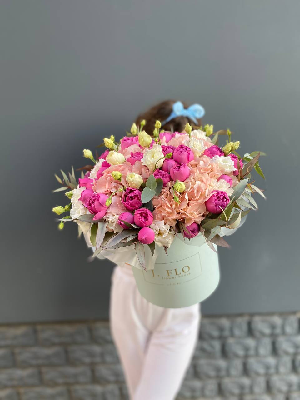 Воздушные соцветия мисти баблс собраны в компактную композицию с мягкими серо-зелеными оттенками. Миниатюрный эвкалипт добавляет свежести и завершает образ.