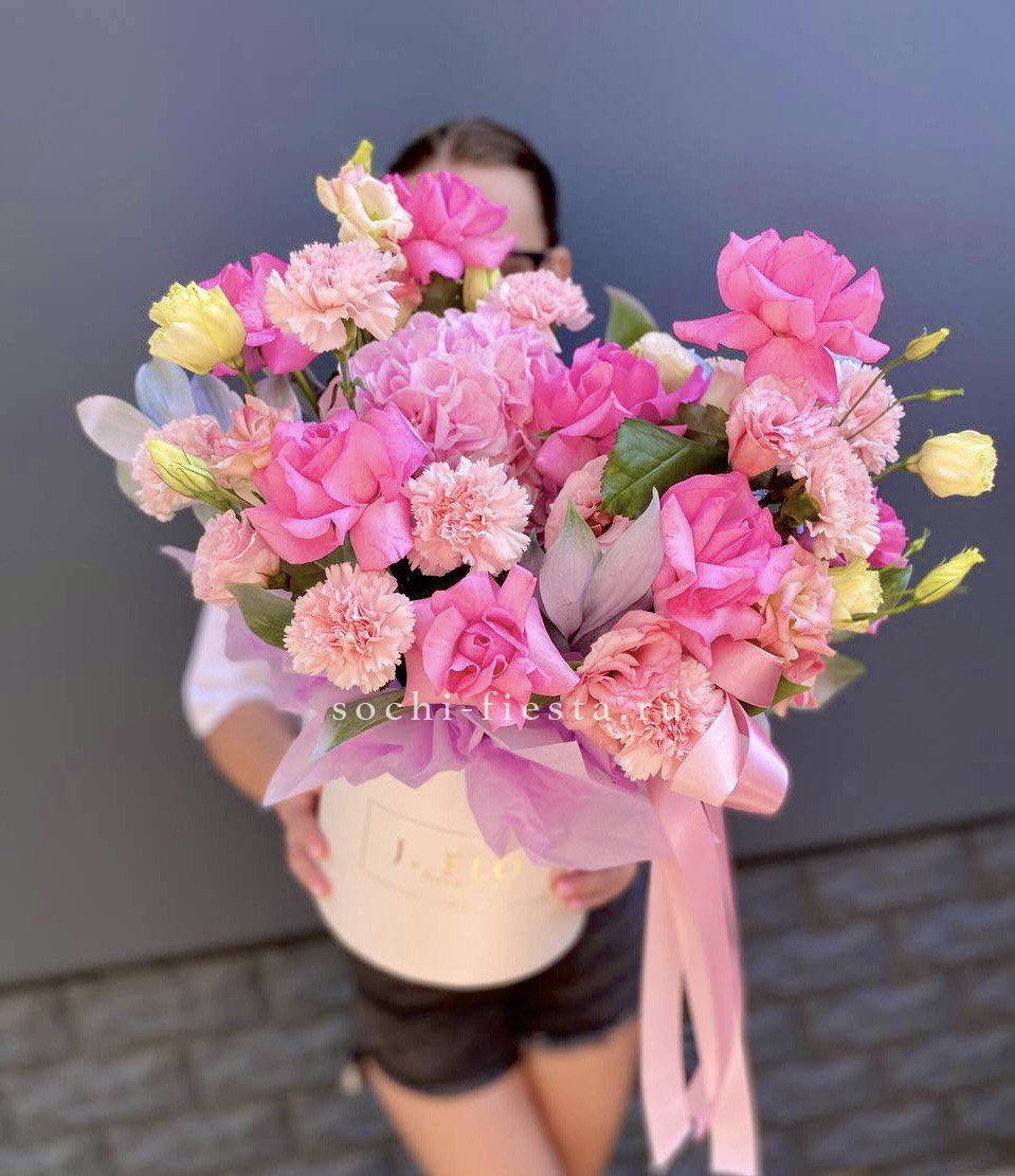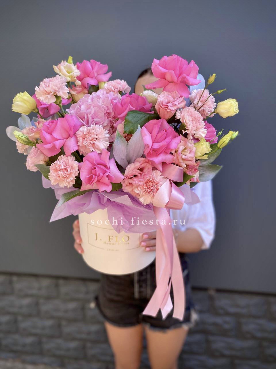 Воздушная композиция в бархатной коробке раскрывается пышными соцветиями гортензии и многолепестковыми бутонами эустомы. Розы двух оттенков создают мягкий переход от белоснежного к пудровому. Флористическая пена сохраняет свежесть каждого цветка надолго.