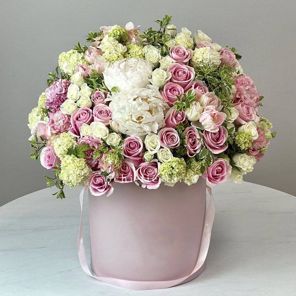 гортензия, пионовидные розы, эустома, эвкалипт, бокс 16.