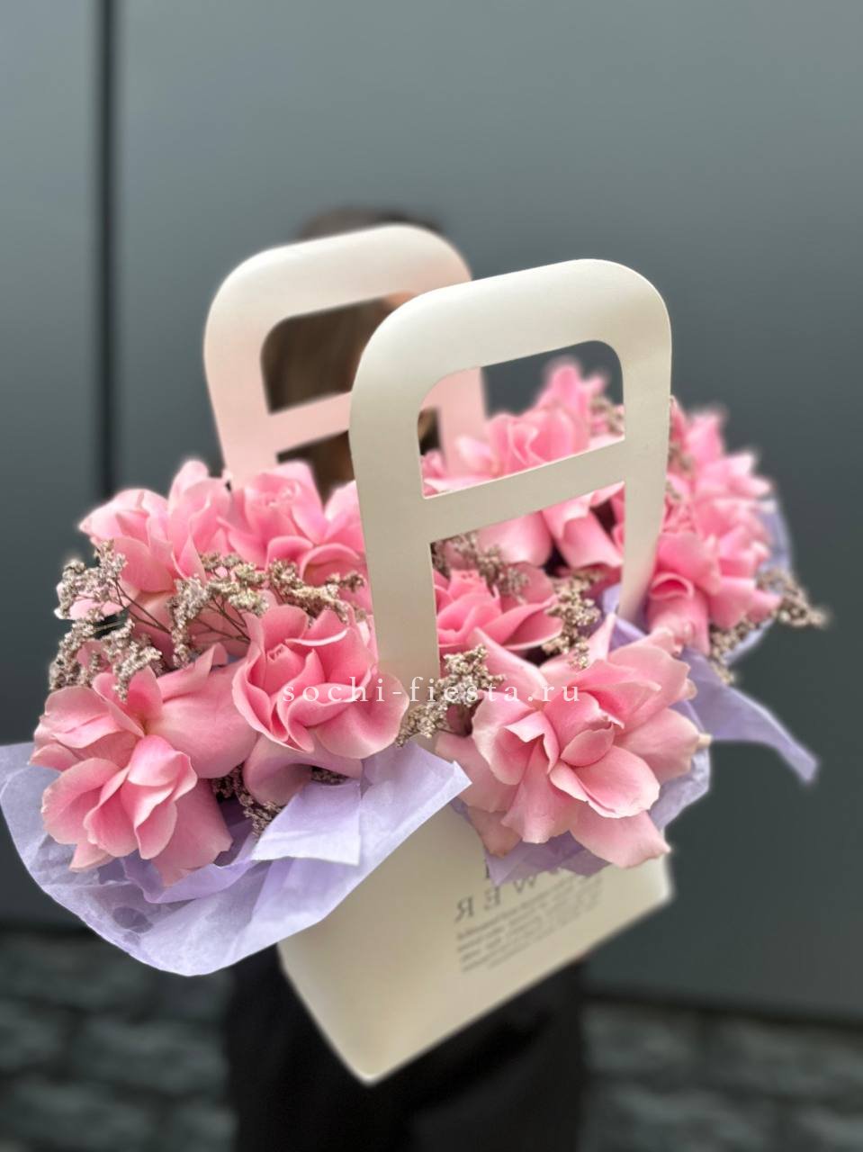Розовые розы встречаются с орхидеей цимбидиум в объемной сумке-кашпо. Эустома и диантус создают многослойность, а кустовые розы заполняют пространство между крупными бутонами. Композиция держит форму и радует насыщенностью.