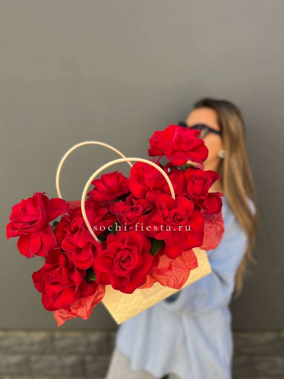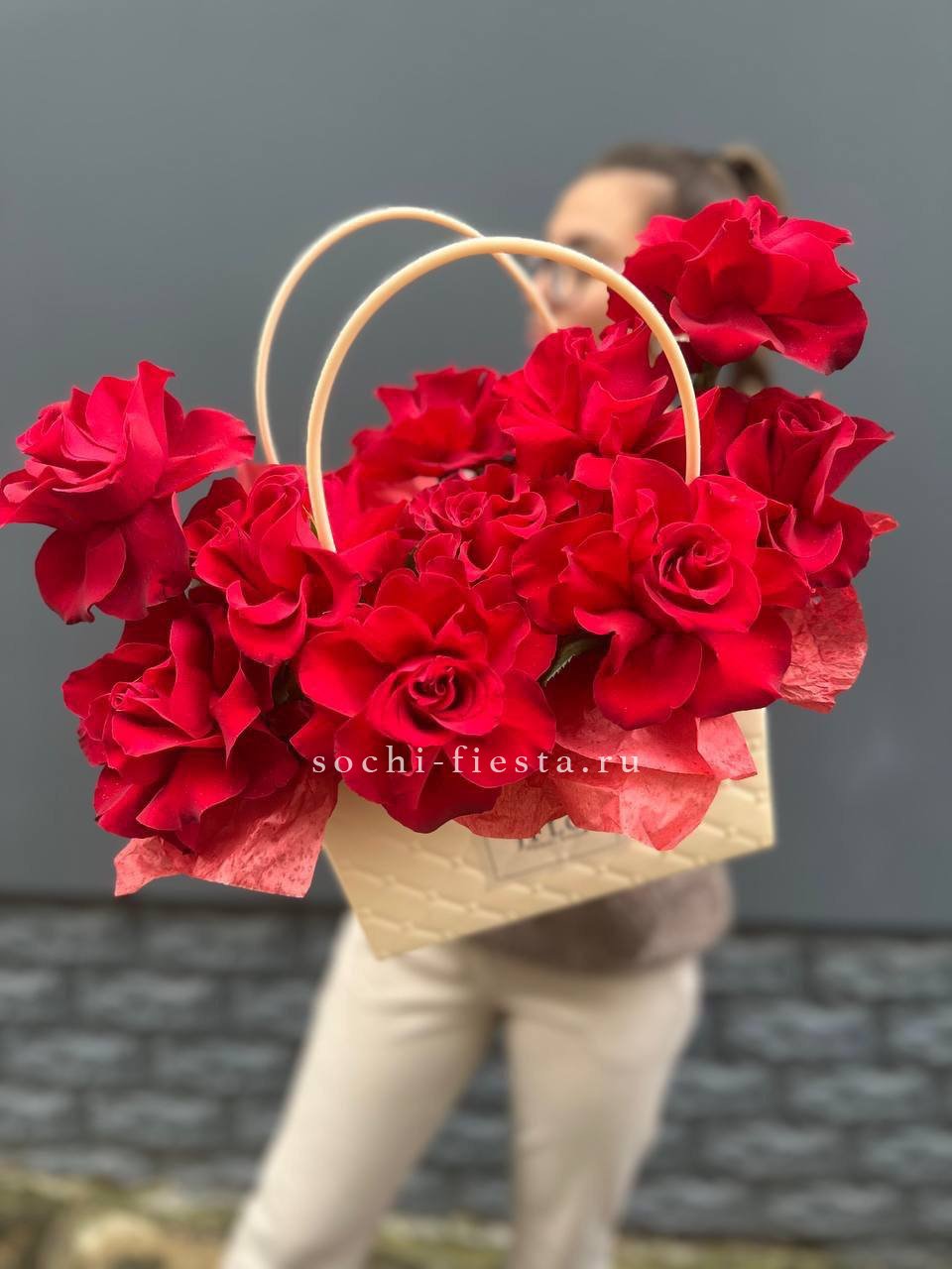 гортензия, розы, эустома, эвкалипт, диантус, лента, сумка.