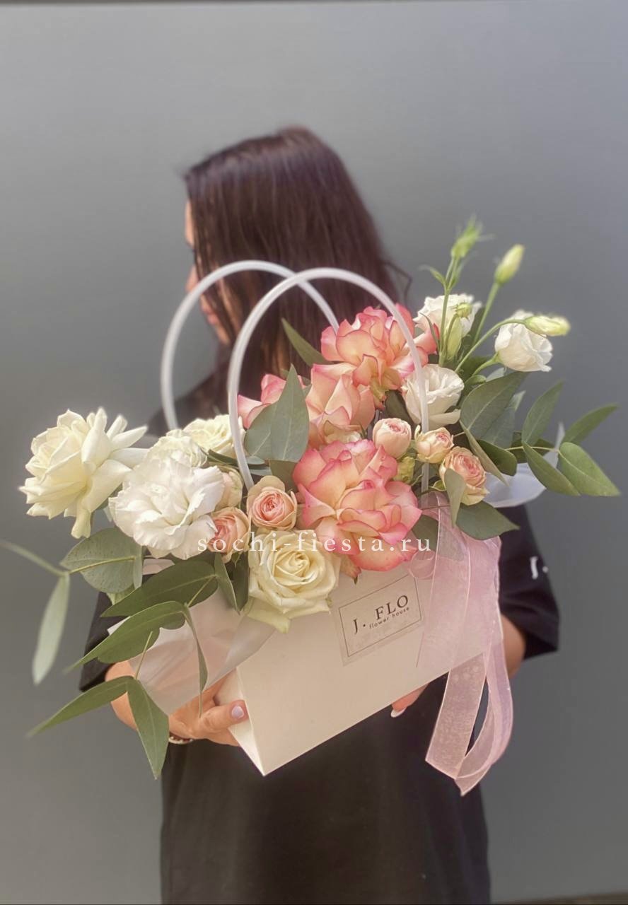 Белые и розовые розы образуют воздушную композицию с мягкими коробочками хлопка и лимониумом. Сумка-кашпо Sofi держит форму и позволяет разместить цветы на столе или полке. Букет выглядит аккуратно и остается свежим долгое время.