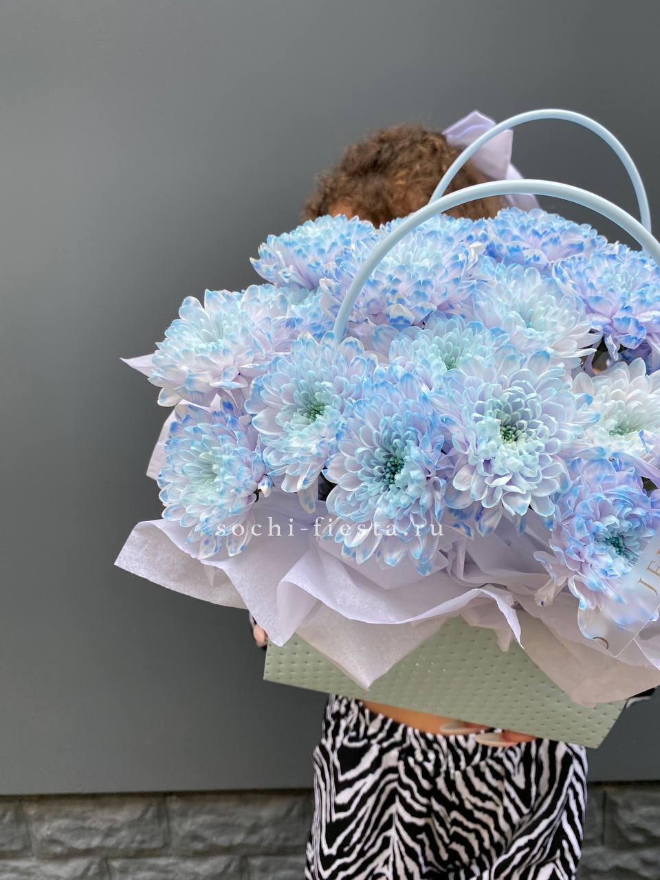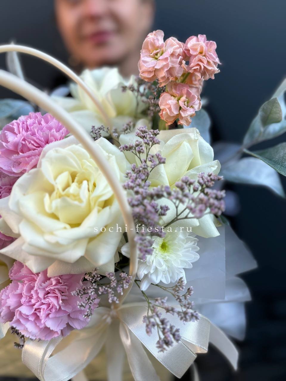 Белые розы и хризантемы сочетаются с воздушной эустомой и хлопком в сумочке. Светлая гамма с прохладным оттенком напоминает морскую свежесть и создает спокойное настроение.