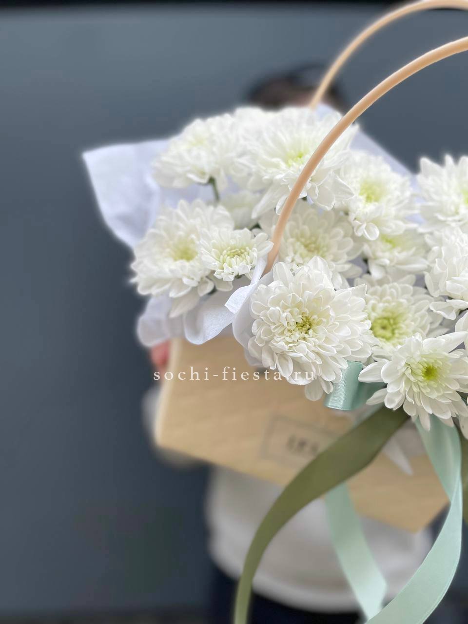 хризантема кустовая, лента, сумка-кашпо.