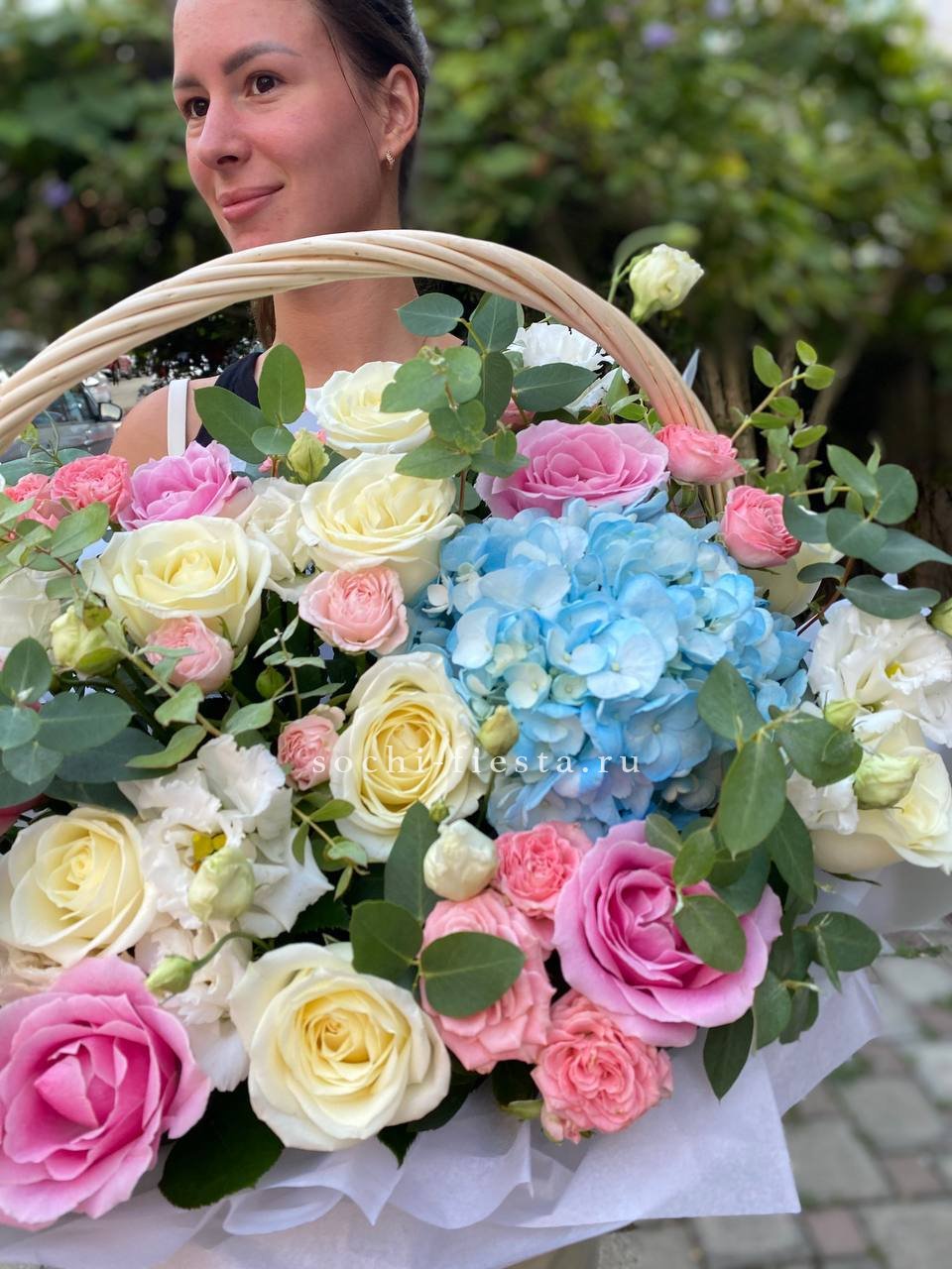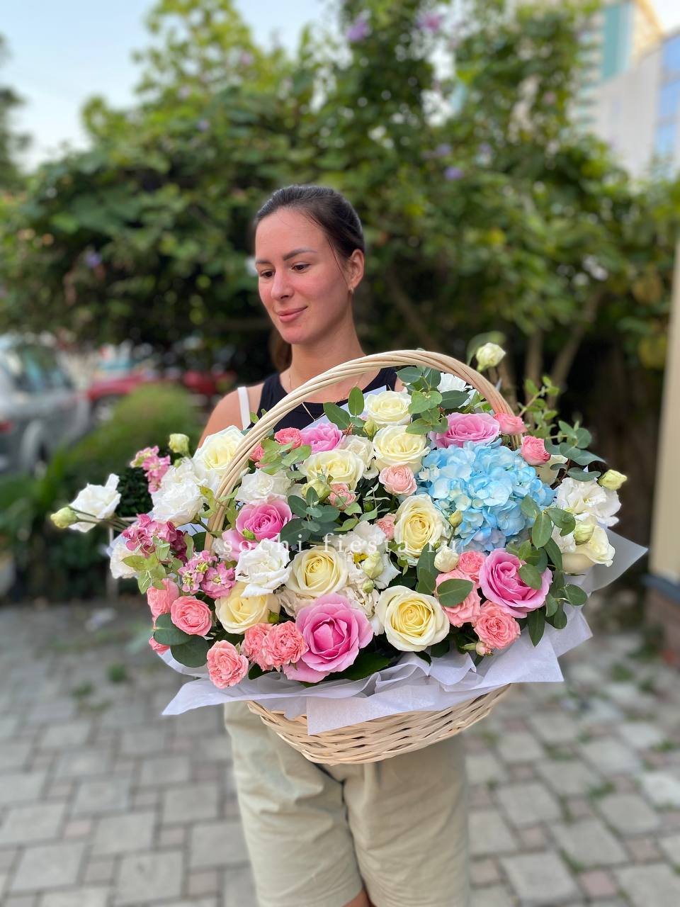 Корзина объединяет гортензии, эустомы, розы и маттиолу в многослойную композицию. Разные фактуры лепестков создают визуальную глубину и насыщенность.