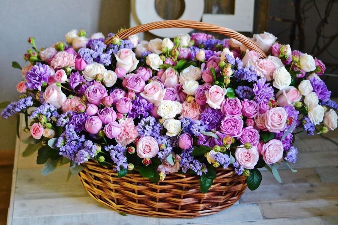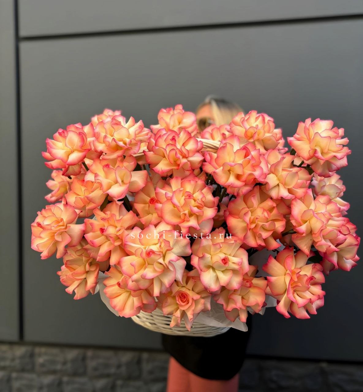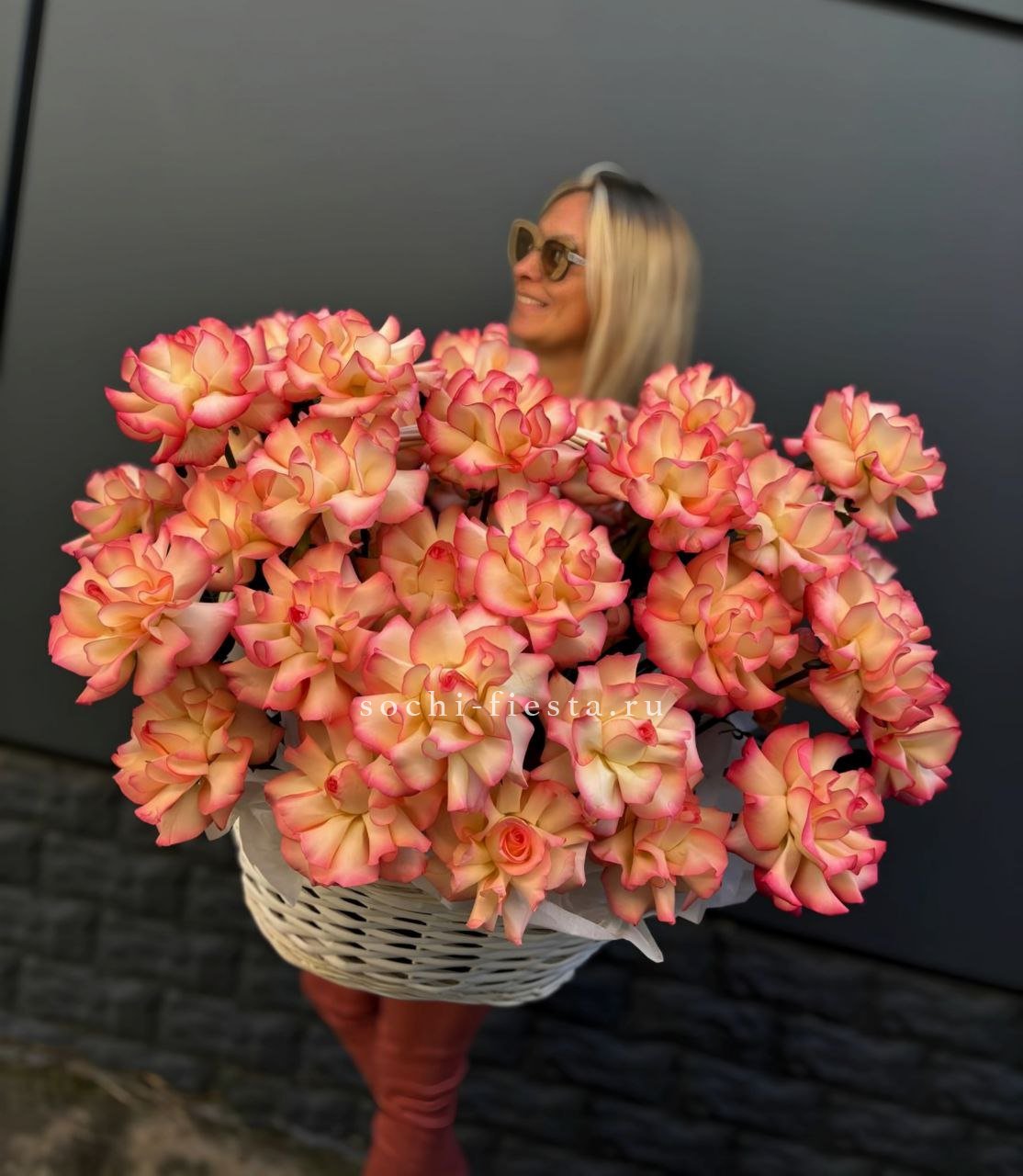 Пышная композиция в корзине собрана из роз двух видов и воздушной эустомы в бело-розовой гамме. Фисташка добавляет свежести, а округлая форма создает ощущение наполненности и объема.