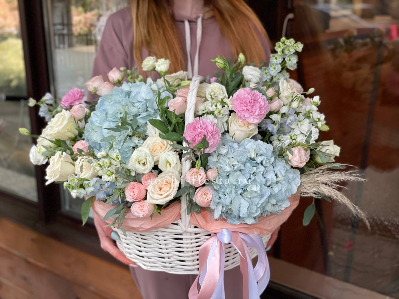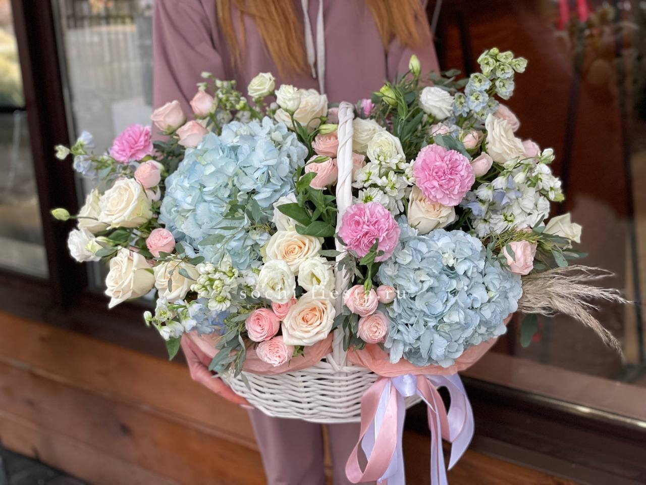 Здесь идеально сочетаются крупные, бархатистые бутоны роз, облака гортензии и мелкие акцентные цветы. Получилась невероятно воздушная и легкая композиция, которая мгновенно создает ощущение праздника и весеннего настроения. Стильный бант завершает этот изысканный образ.