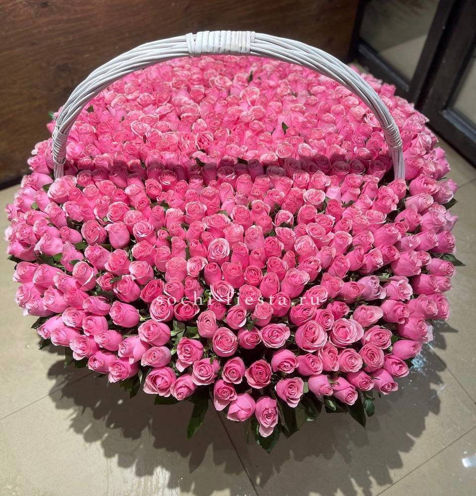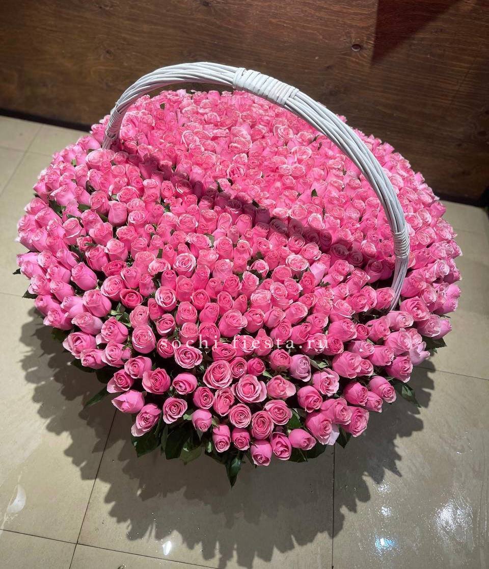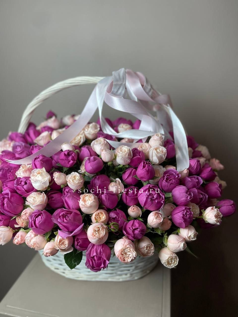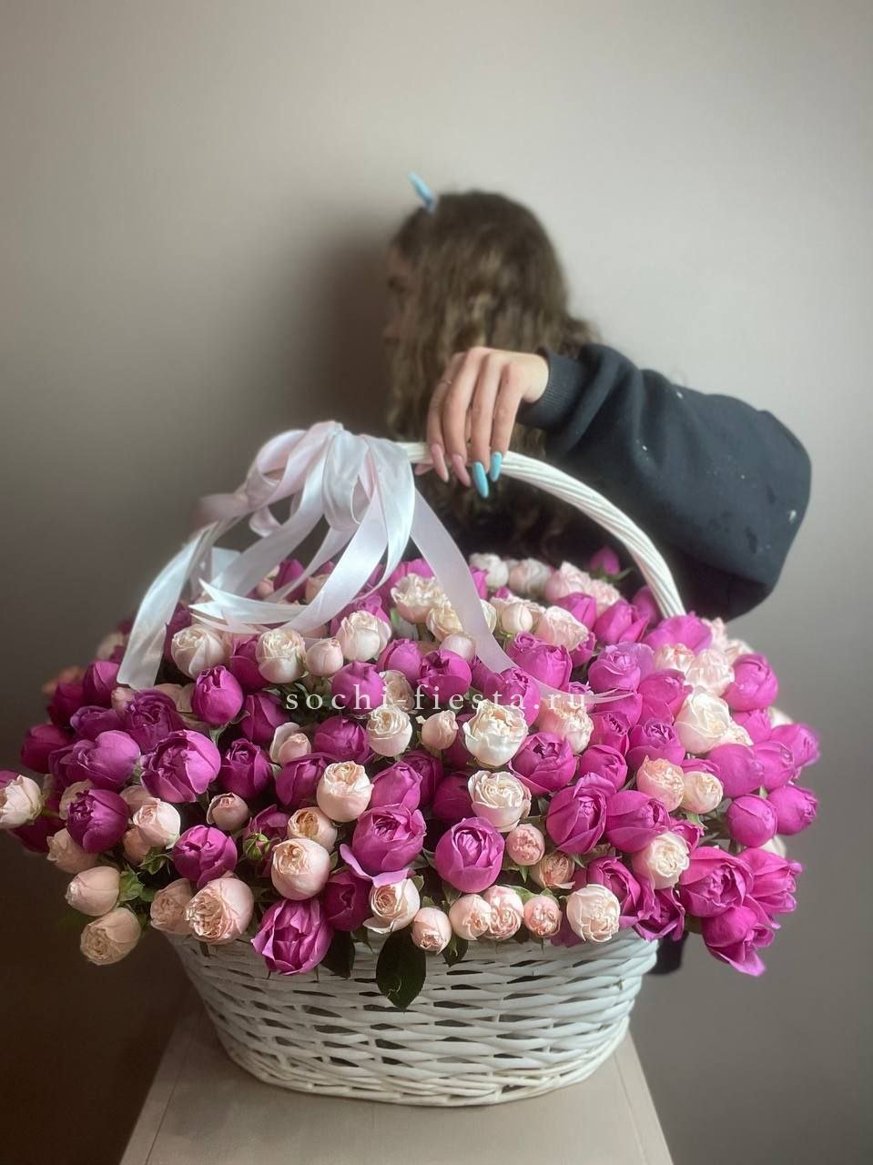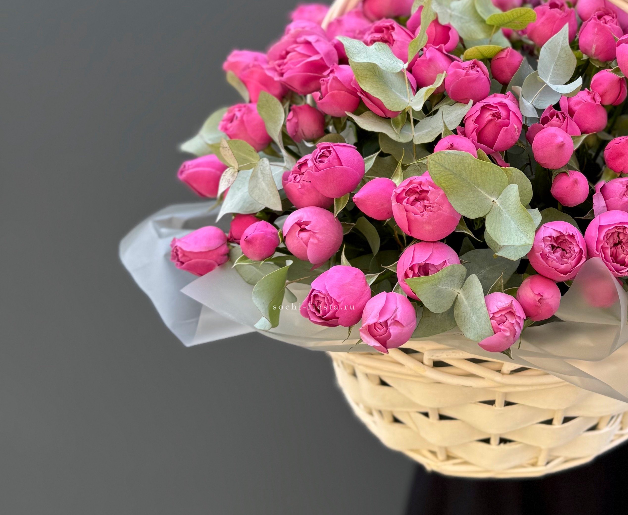 Сорок одна пионовидная роза в светлой корзине выстраивает объёмную композицию с мягкими переливами лилового и розового. Эвкалипт обрамляет густую россыпь бутонов.