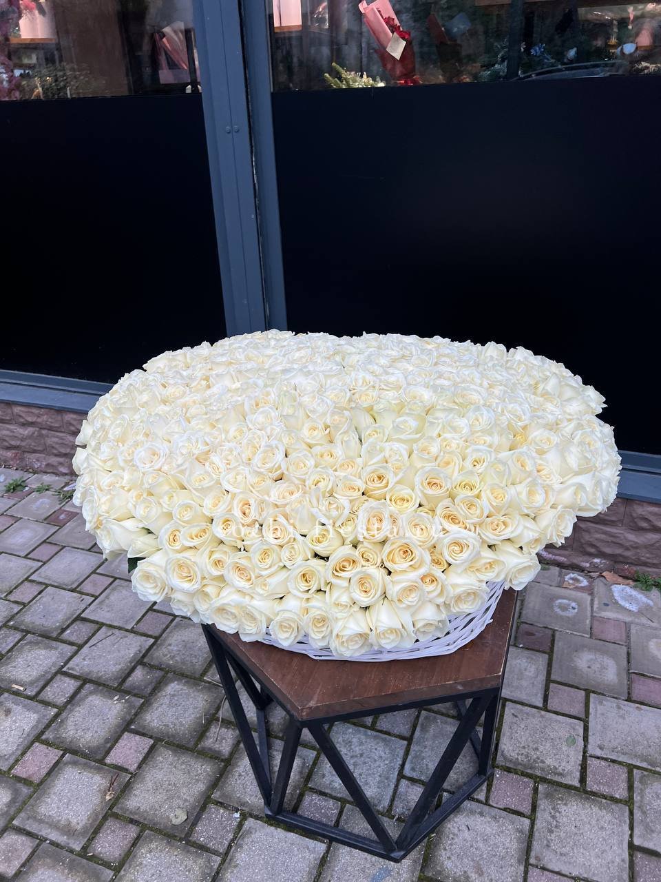 Монументальная композиция из полутора сотен белоснежных бутонов создает впечатление цветочного облака. Корзина придает устойчивость и завершенность форме, позволяя разместить такой масштабный ансамбль в любом пространстве.