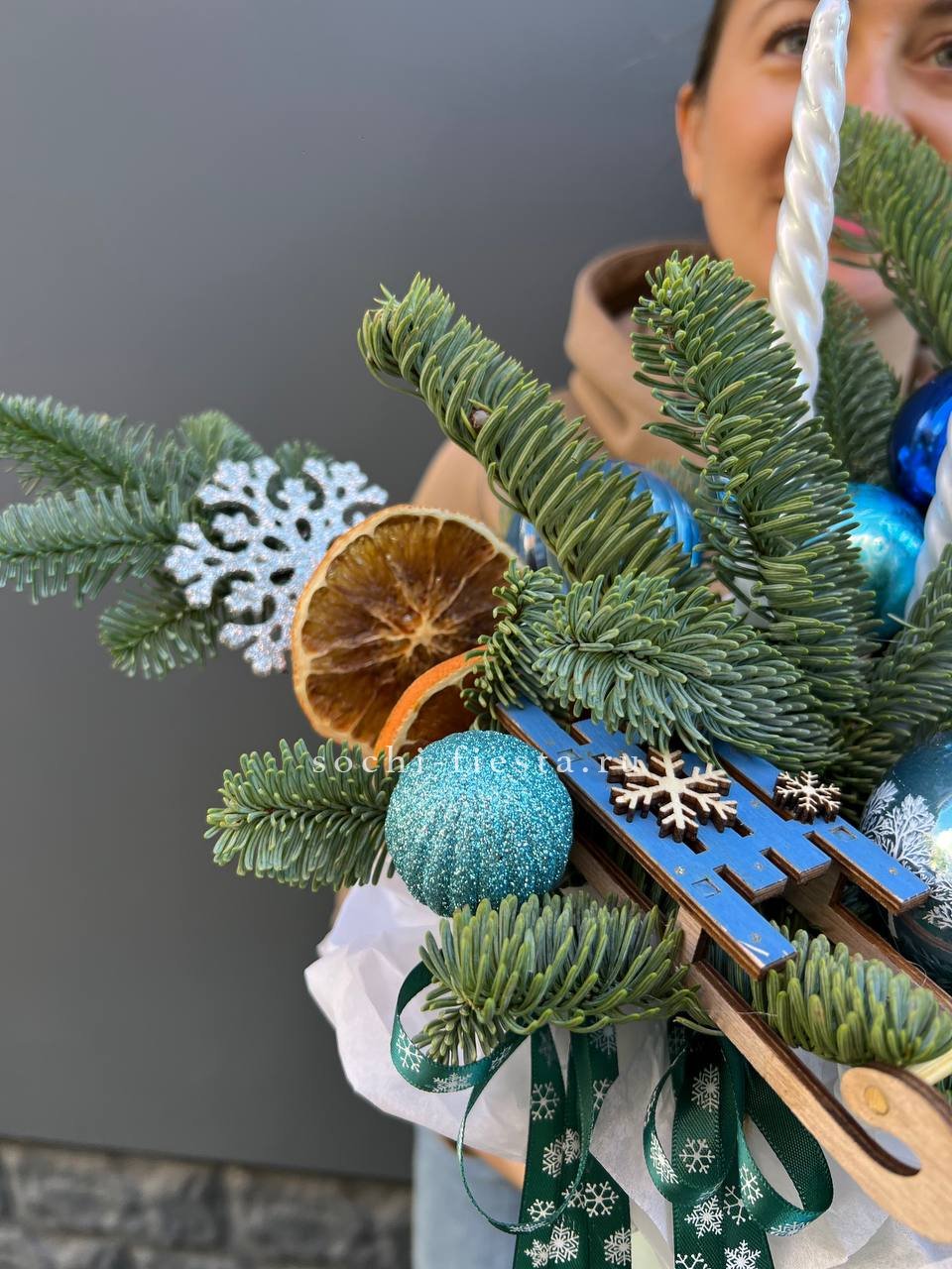 Компактная композиция в синей гамме собирает вокруг свечей ветки нобилиса и праздничные украшения. Цилиндрическая форма удобно размещается на столе или комоде. Живая хвоя сохраняет свежесть на протяжении всех праздников.