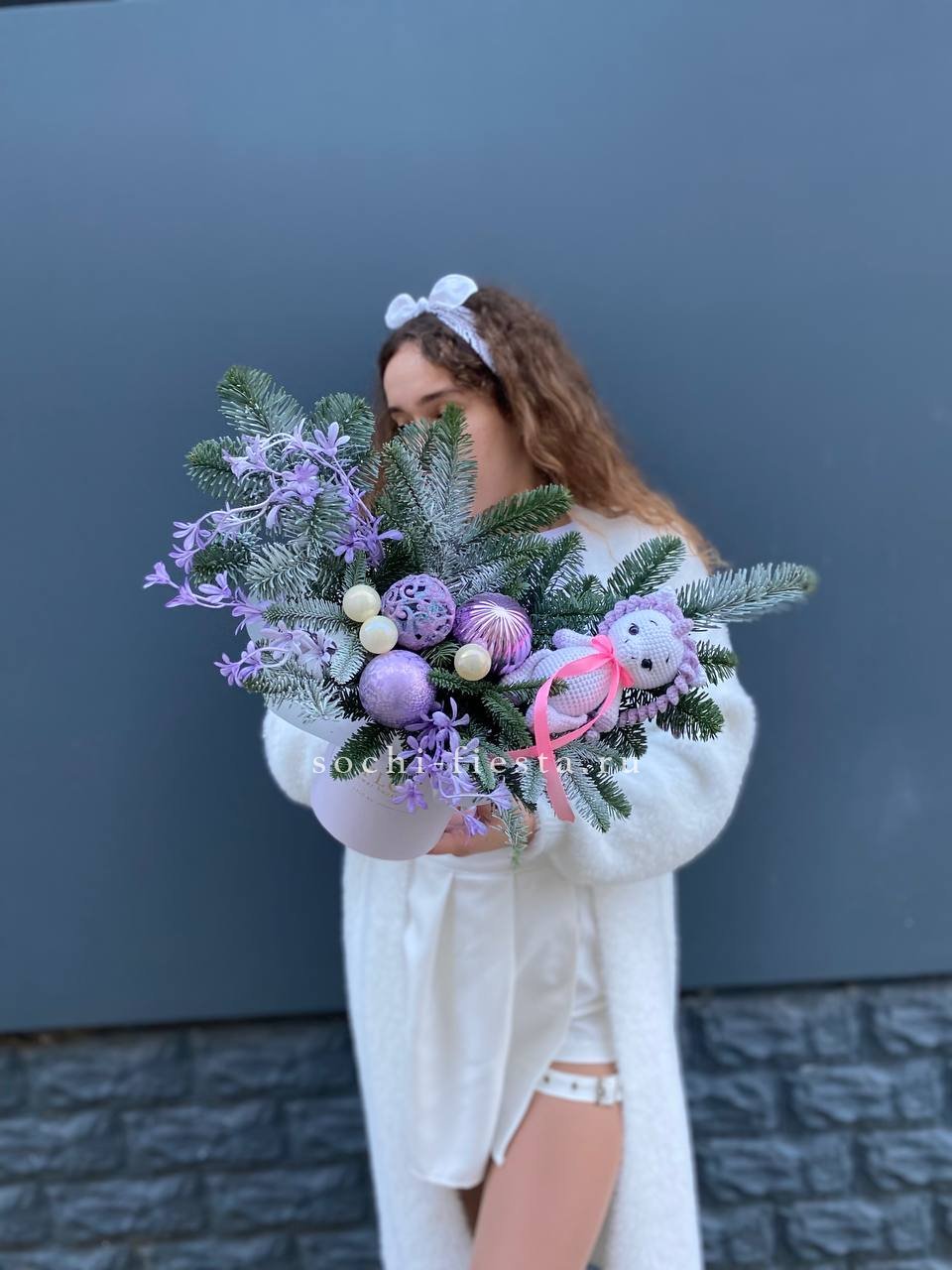 Пышная зелень нобилиса обрамляет фигурку единорога и праздничные украшения. Композиция выстроена в цилиндре на флористической основе. Яркие шары добавляют цветовых акцентов между ветвями.