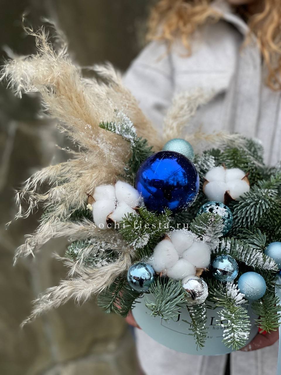 датский нобилис, игрушки, хлопок, помпасная трава (сухоцветы) оазис, бокс, лента Готовая композиция может иметь незначительные внешние отличия от примера на фотографии.