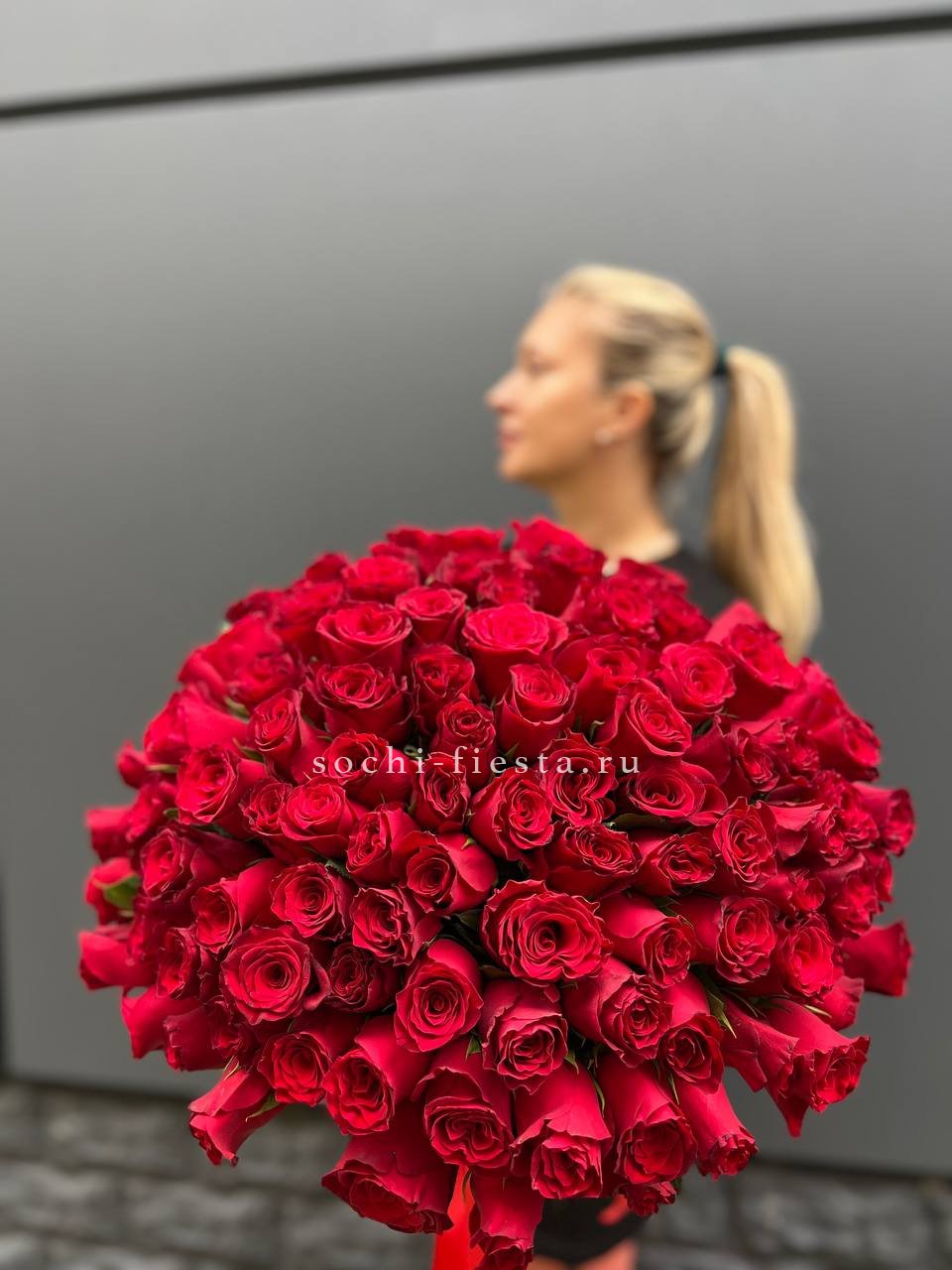 Сто один бутон насыщенного алого оттенка собраны в плотную охапку. Классика жанра в масштабном исполнении для тех моментов, когда слова не нужны.