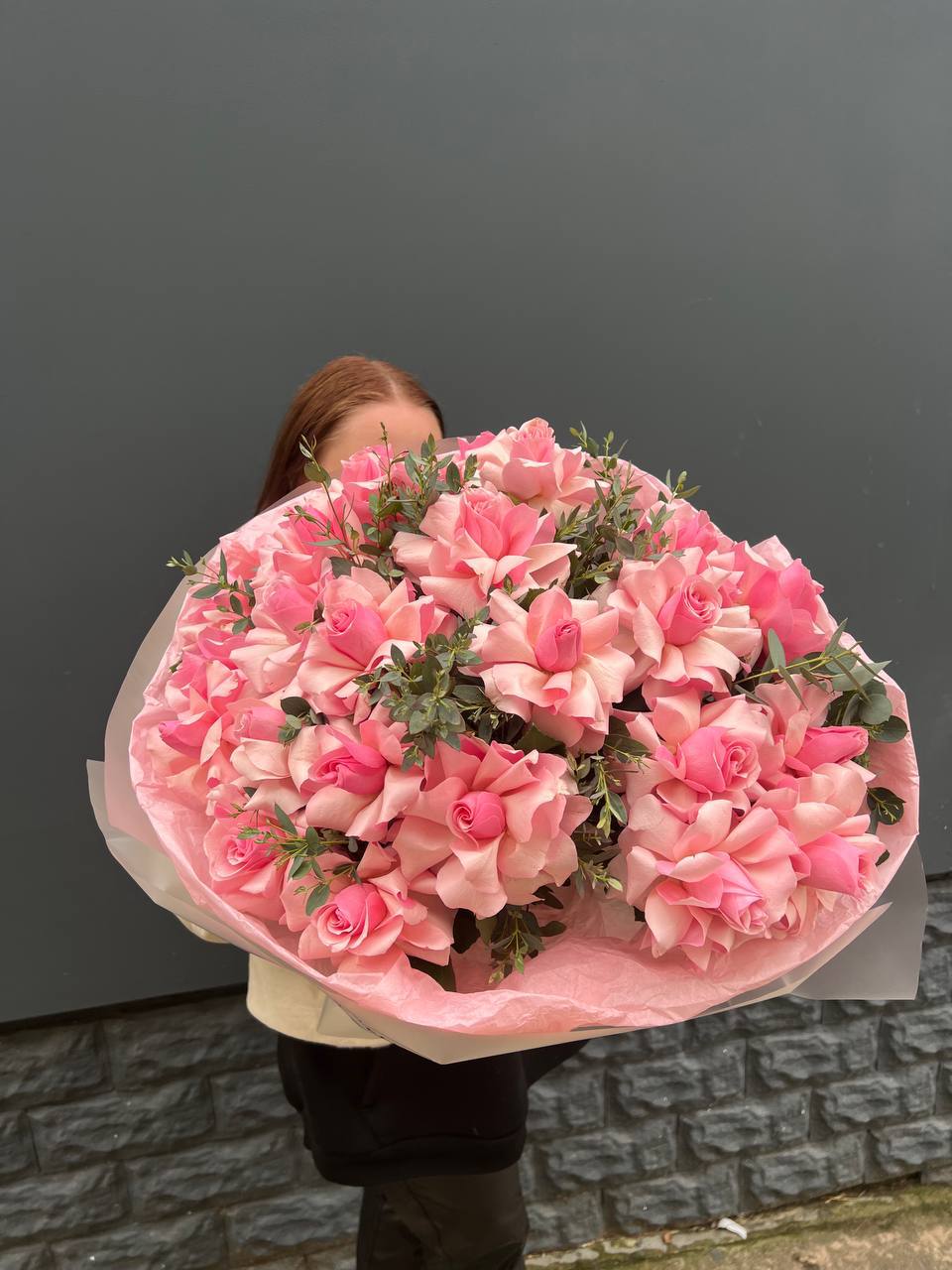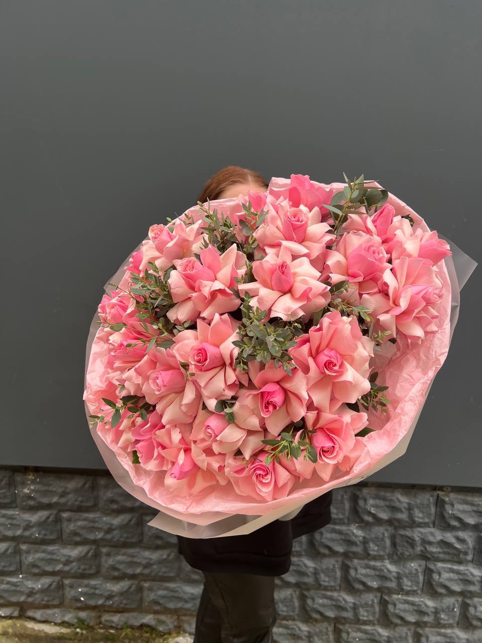 Состав букета на фотографии: 29 роз карина, крафт, лента