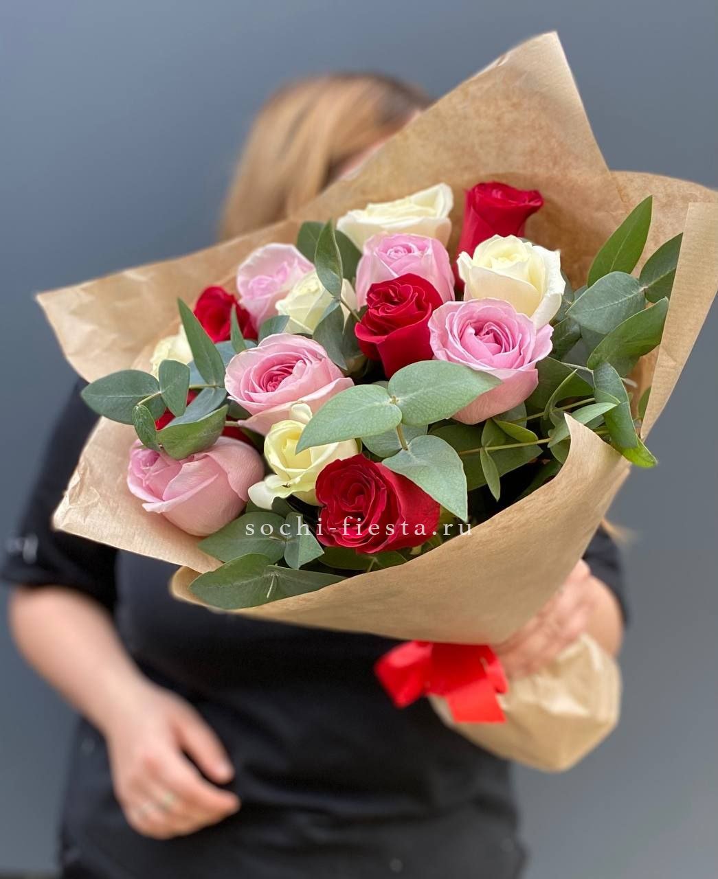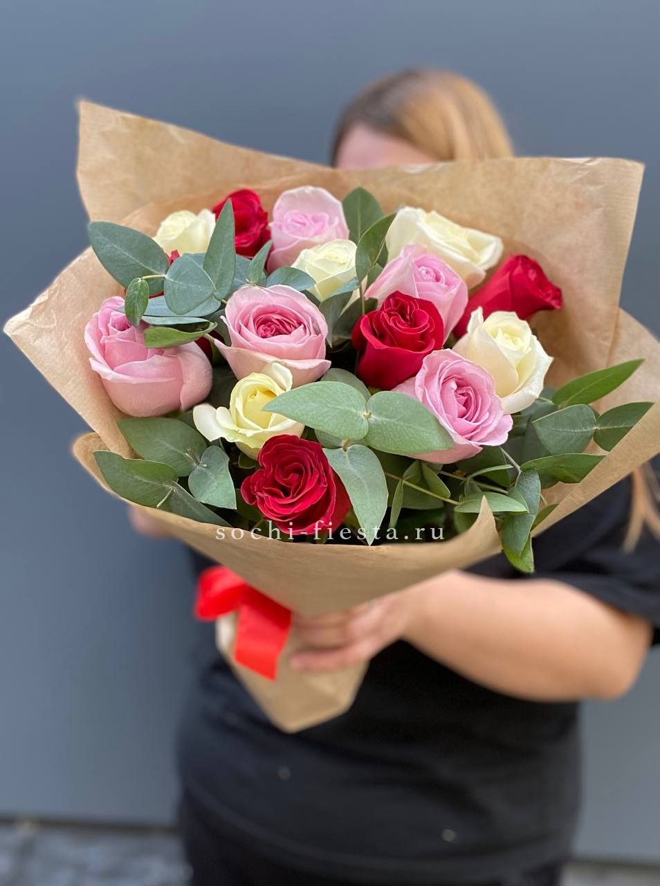 101 роза разноцветных оттенков, лента, упаковка на выбор.