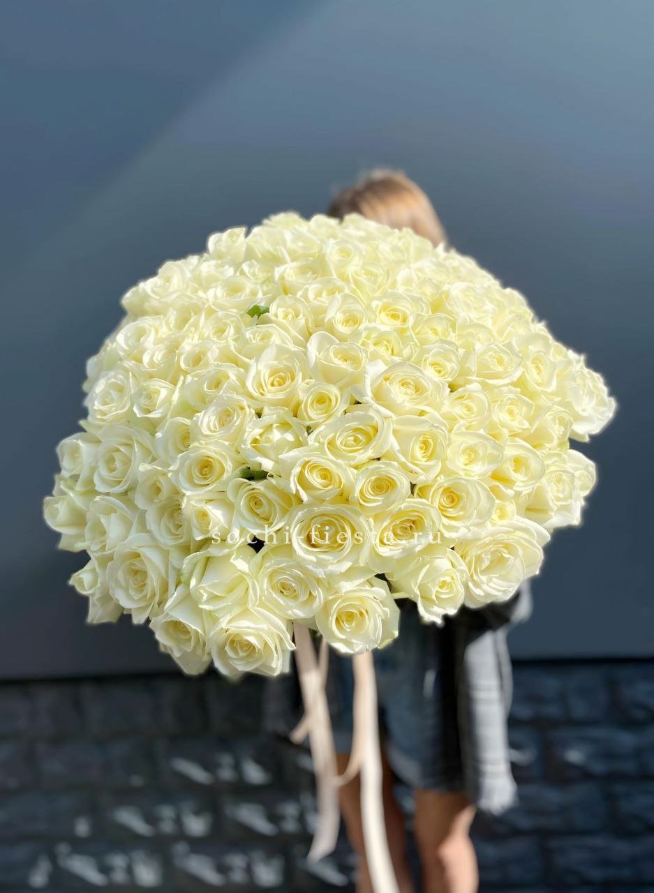 Сто один бутон в бело-розовой палитре создают объёмное облако цвета. Композиция впечатляет масштабом и наполняет пространство мягким сиянием лепестков.