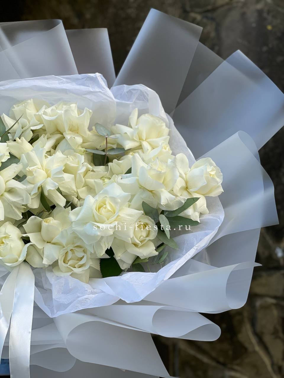 Вывернутые лепестки открывают внутреннюю архитектуру каждого бутона и придают букету скульптурную выразительность. Эвкалипт вплетается между цветами, добавляя воздуха и свежести общей композиции.