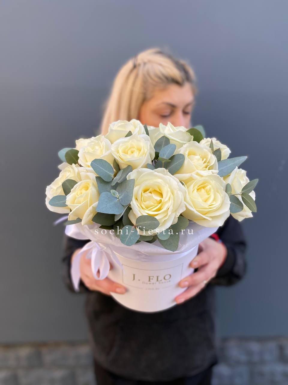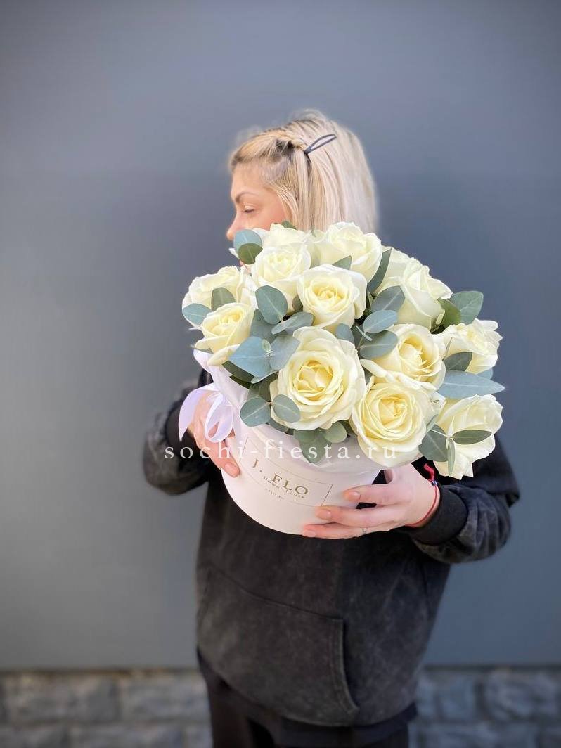 Тридцать пять белых бутонов образуют плотный монохромный ансамбль. Классическая форма и чистота оттенка позволяют букету звучать самодостаточно в любом интерьере.
