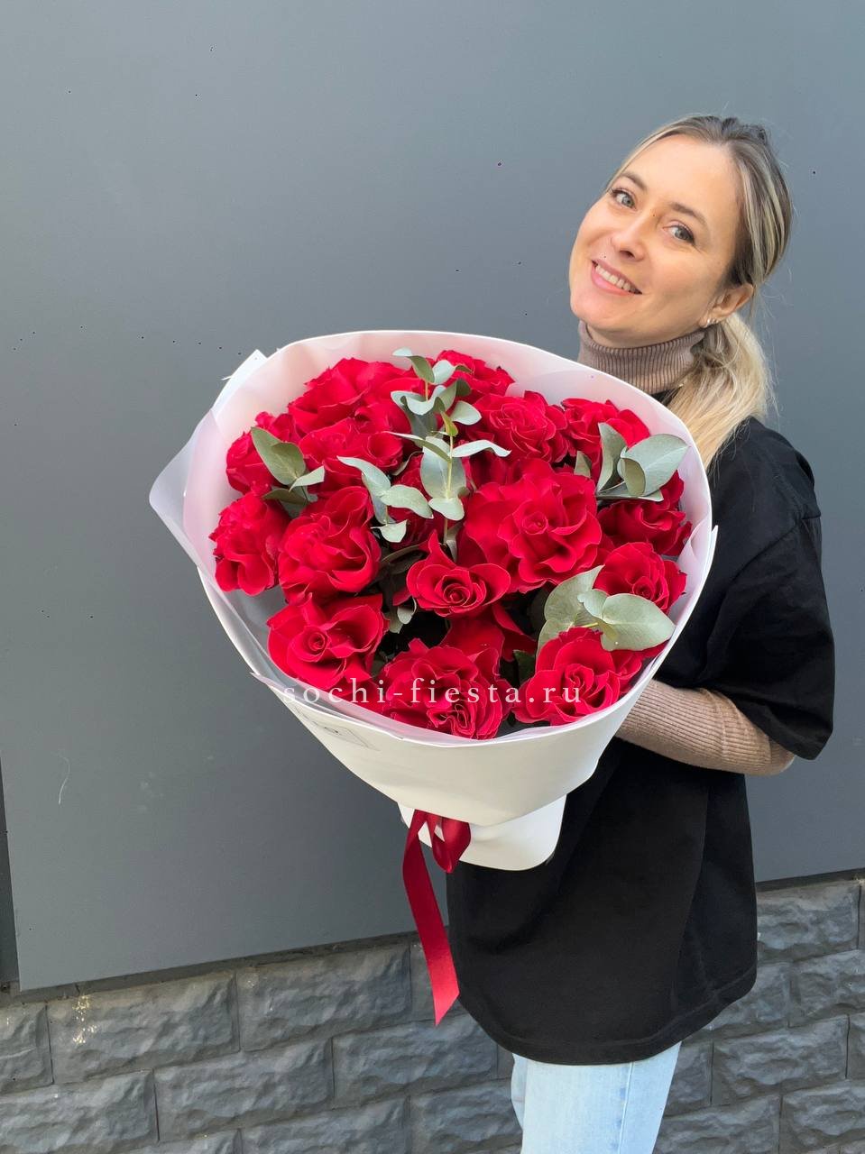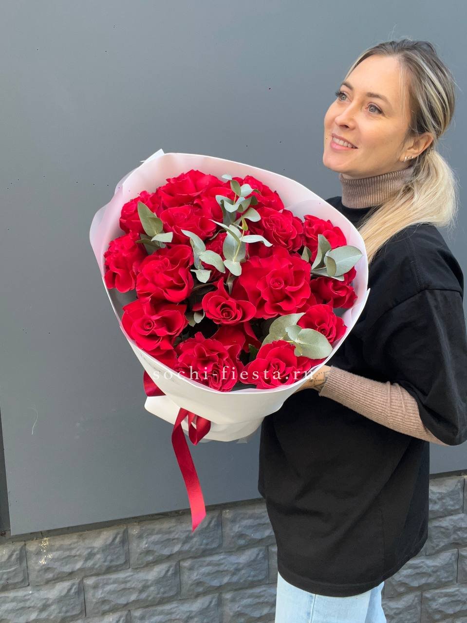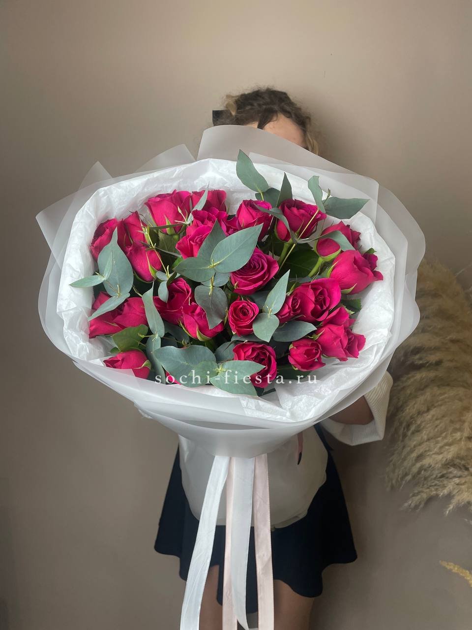 Тридцать пять бутонов с развернутыми лепестками создают насыщенное красное пятно в пространстве. Эвкалипт обрамляет композицию и добавляет воздуха между цветками.