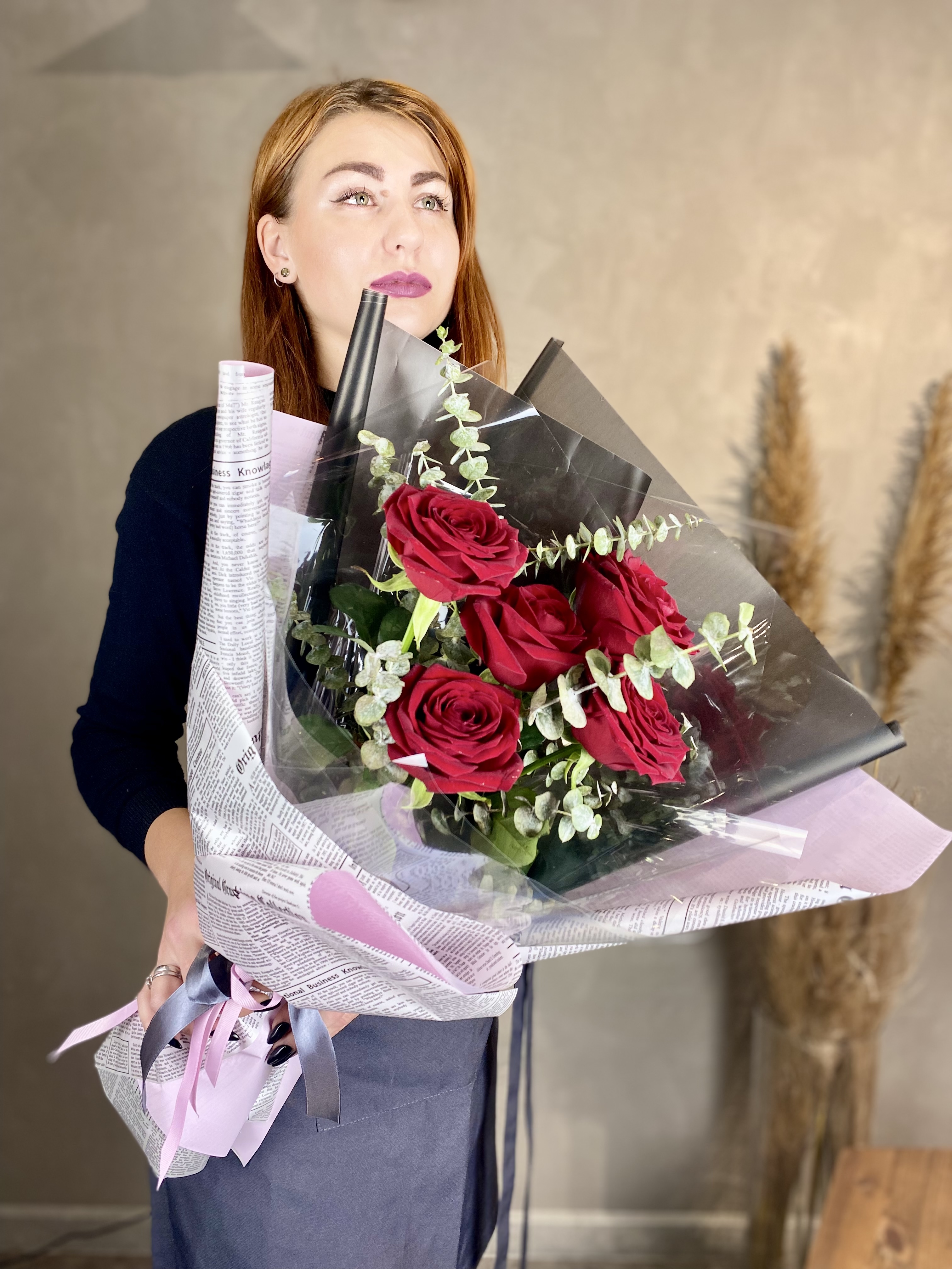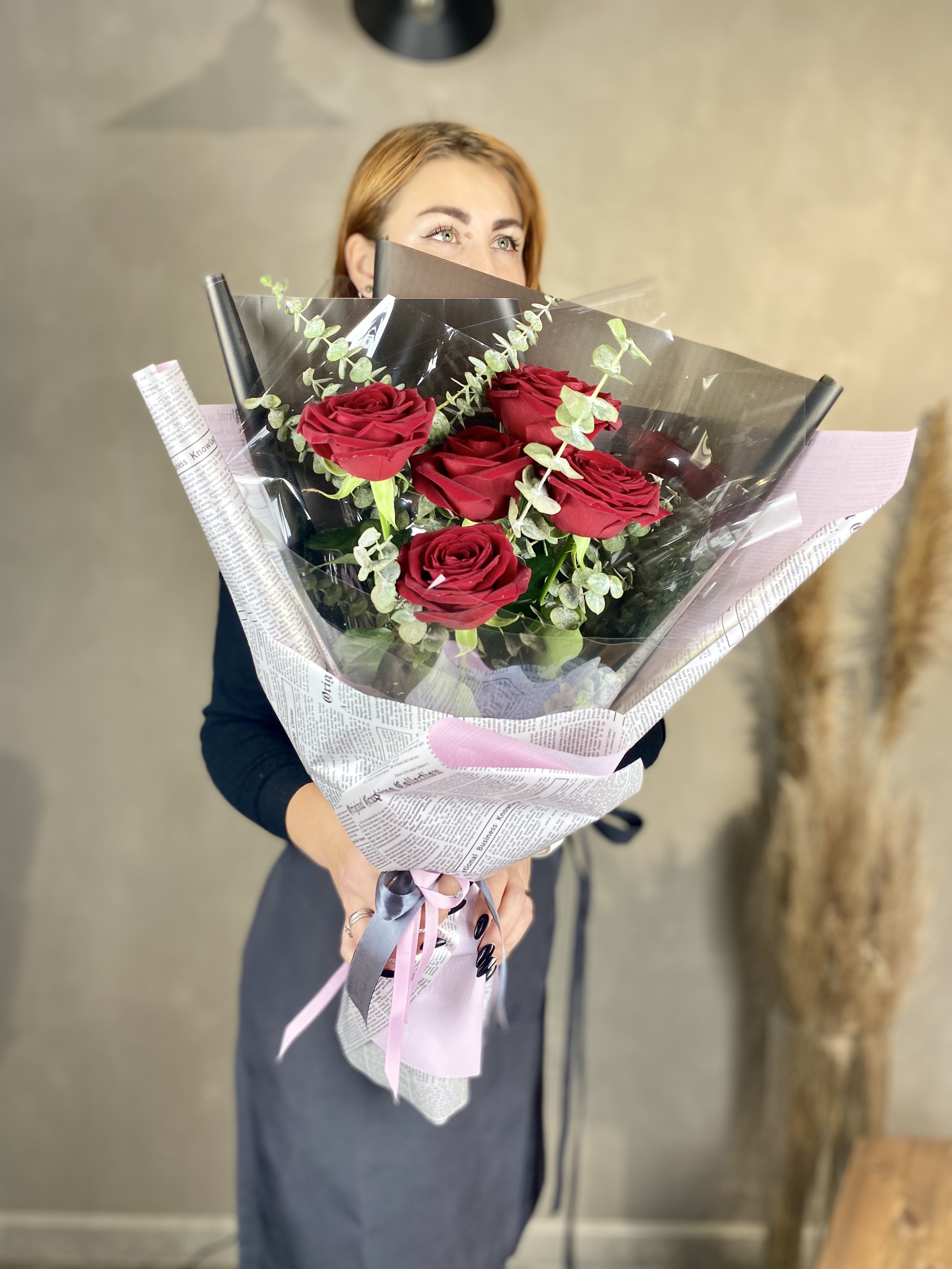 Пять алых бутонов собраны в лаконичную вертикальную форму. Серебристый эвкалипт добавляет воздуха между стеблями. Минималистичная подача для тех, кто ценит сдержанность.