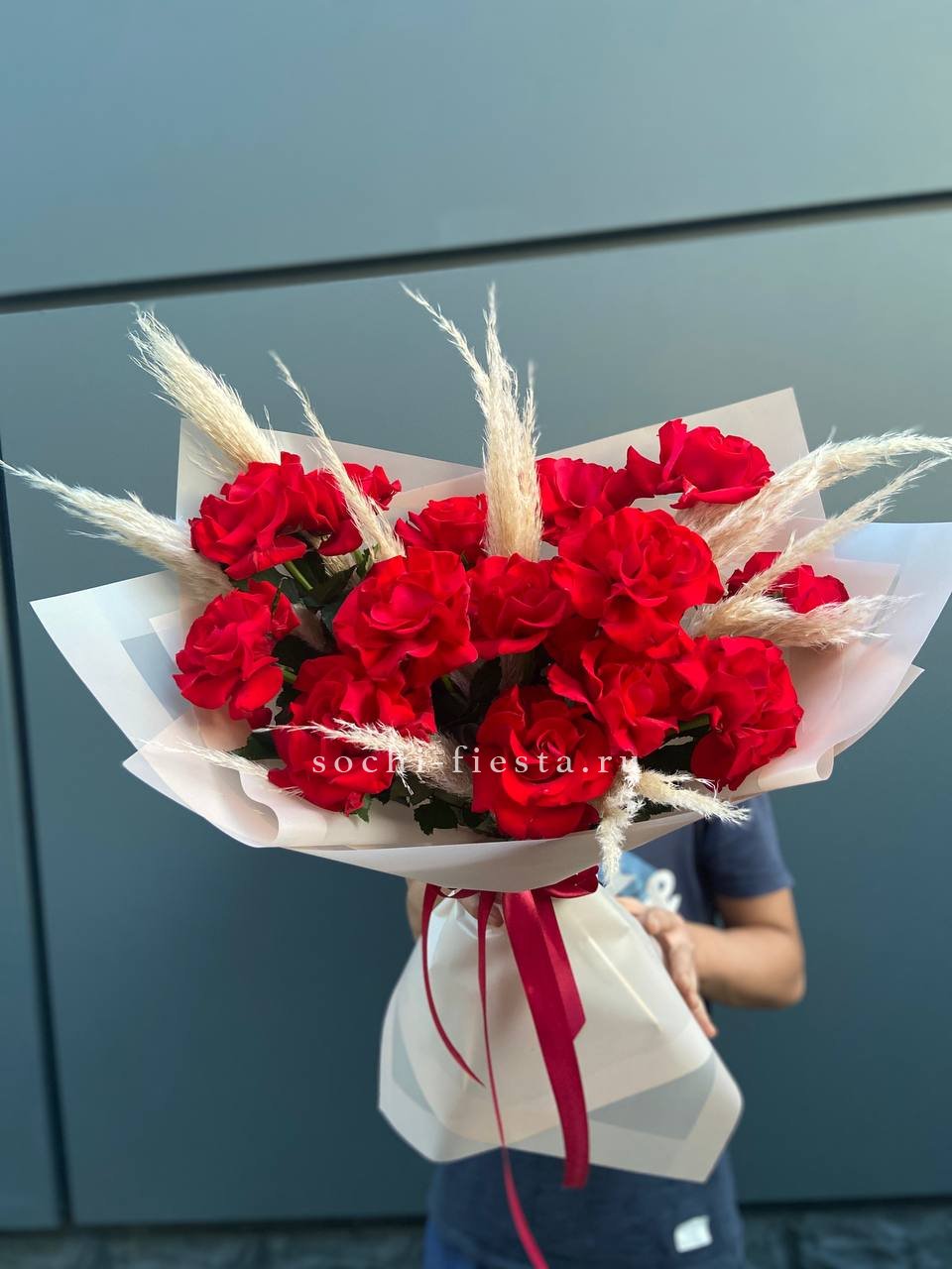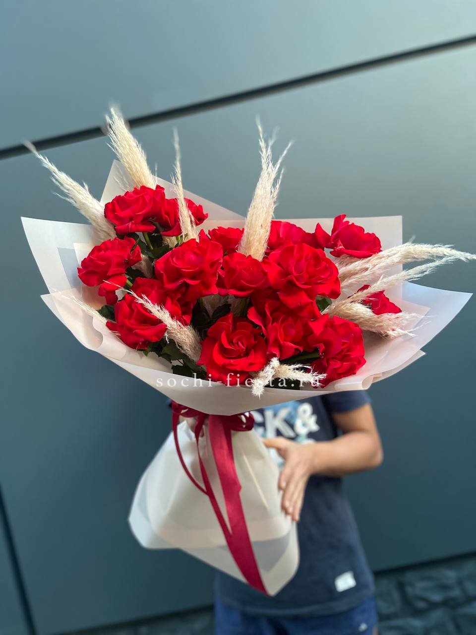 Вывернутые лепестки французских роз раскрываются широко и создают объёмную текстуру. Пампасная трава добавляет воздушности и смягчает линии. Пятнадцать бутонов в авторской упаковке выглядят свежо и современно.